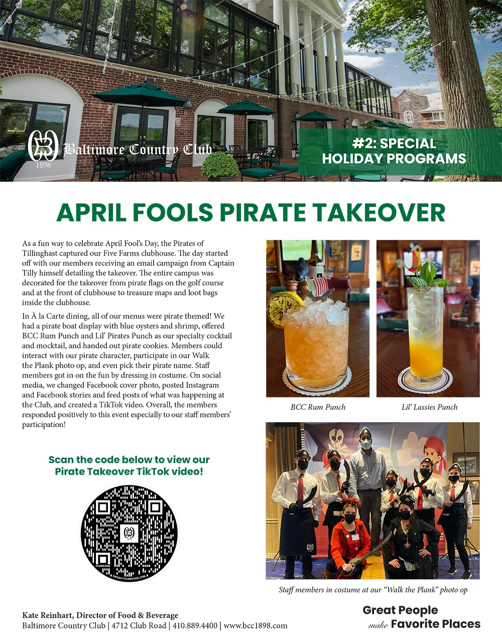 In À la Carte dining, all of our menus were pirate themed! We had a pirate boat display with blue oysters and shrimp, offered BCC Rum Punch and Lil’ Pirates Punch as our specialty cocktail and mocktail, and handed out pirate cookies. Members could interact with our pirate character, participate in our Walk the Plank photo op, and even pick their pirate name. Staff members got in on the fun by dressing in costume. On social media, we changed Facebook cover photo, posted Instagram and Facebook stories and feed posts of what was happening at the Club, and created a TikTok video. Overall, the members responded positively to this event especially to our staff members’ participation!