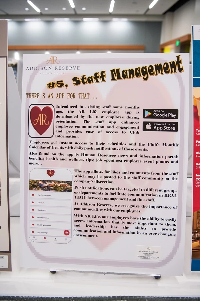 AR Life employee app was introduced to existing staff some months ago and is downloaded to all new employees' phone at the time of their orientation. The app provides a channel of communication between staff members, as well as between staff and their managers. Push notifications are sent for real time changes and event updates. Additionally, staff members may obtain information about Human Resources, Health & Wellness Tips and job openings through the app. Employee event photos are also posted to the apps for all staff members to enjoy. While club members have no direct contact with the app, the operational efficiencies provide a better member experience.