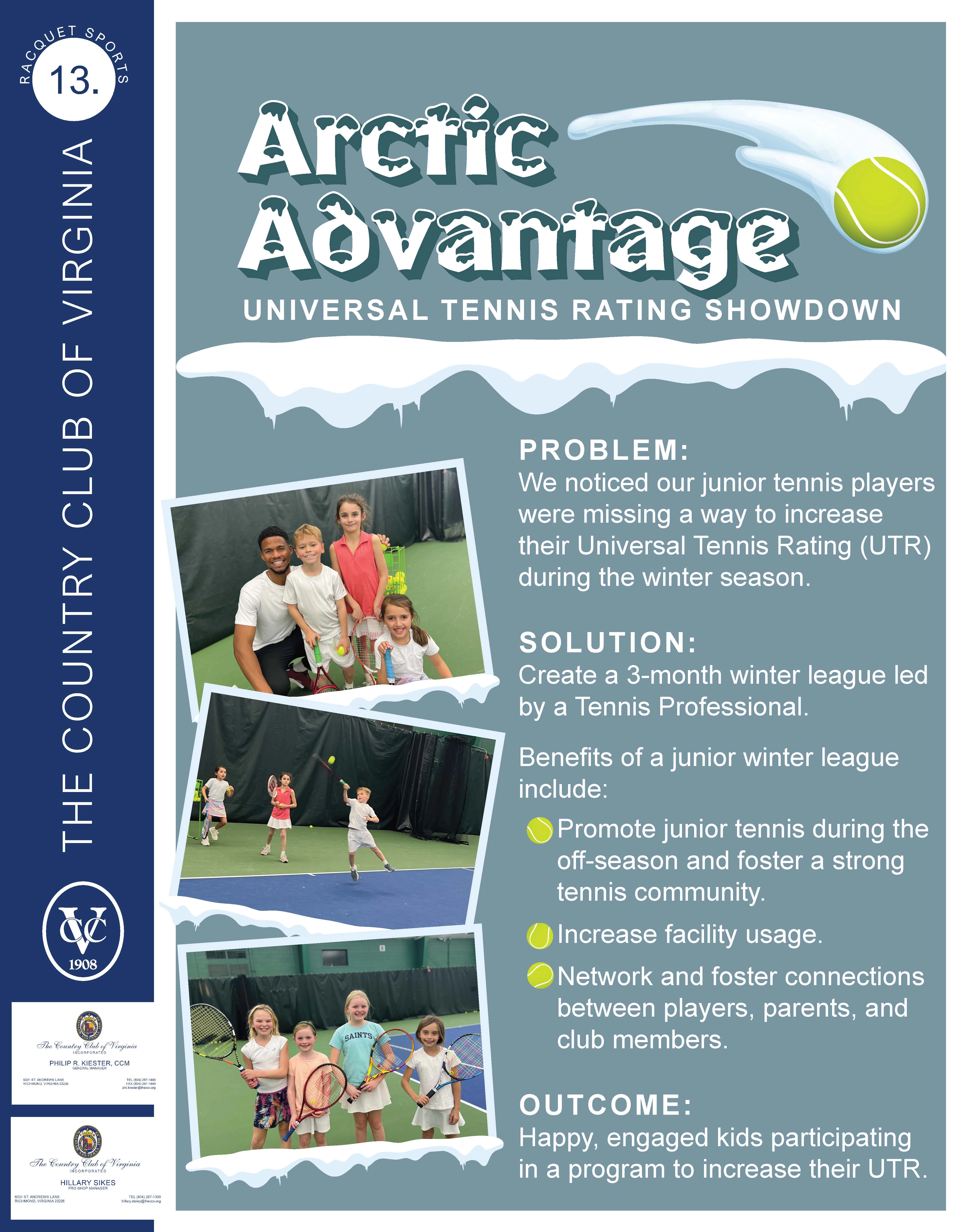We noticed our junior tennis players were missing a way to increase their Universal Tennis Rating (UTR) during the winter season, so we created a three-month winter league led by a Tennis Professional: the Arctic Advantage Program.