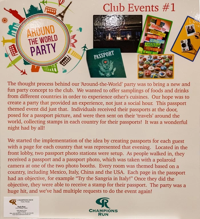 The thought process behind our ‘Around-the-World’ party was to bring a new and fun party concept to the club. We wanted to offer samplings of foods and drinks from different countries in order to experience other’s cuisines. Our hope was to create a party that provided an experience, not just a social hour. This passport themed event did just that. Individuals received their passports at the door, posed for a passport picture, and were then sent on their ‘travels’ around the world, collecting stamps in each country for their passports! It was a wonderful night had by all!