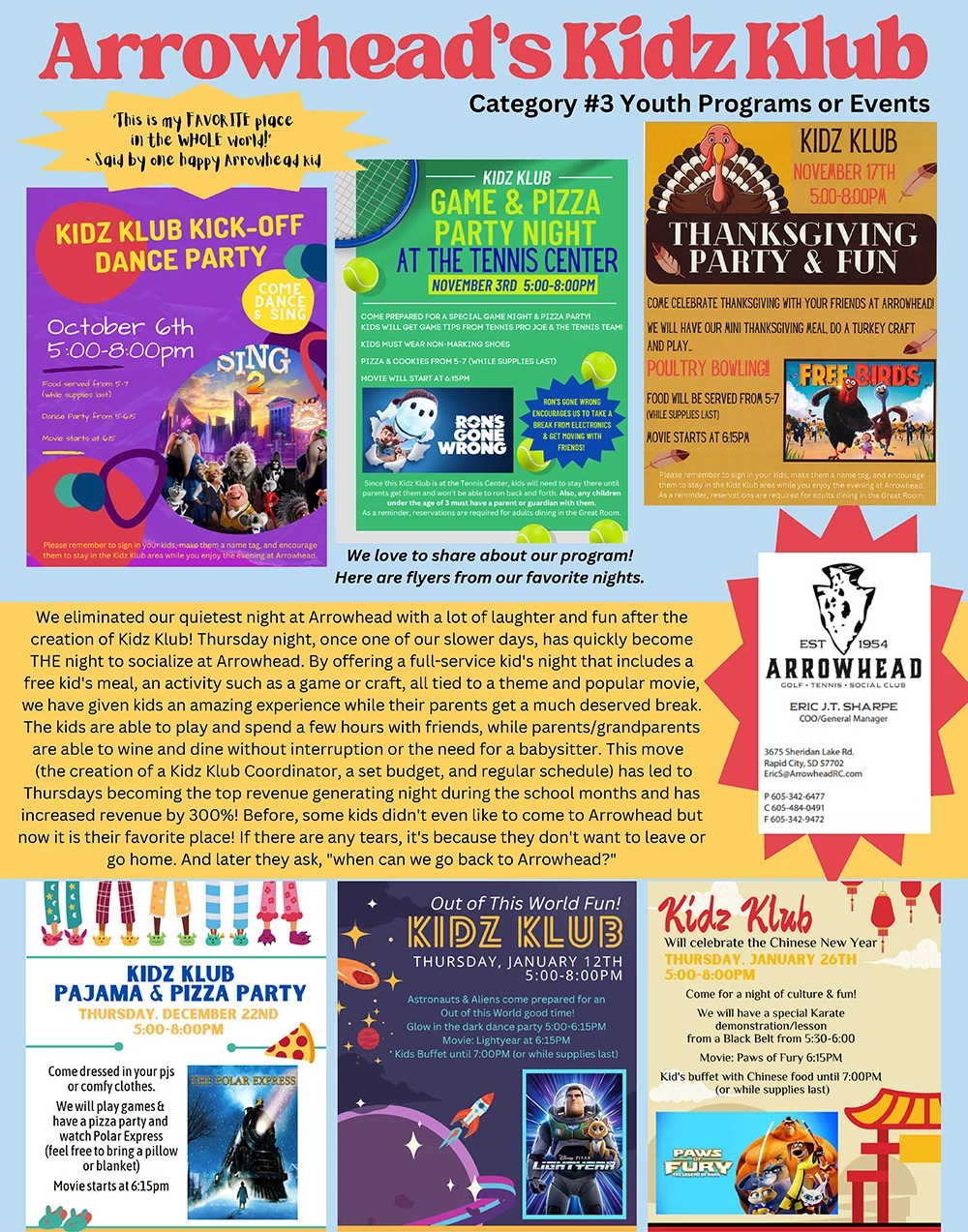 Arrowhead hired a Kidz Klub manager and team. We have implemented a new budget for these events for the next 2 years. The Club has turned a traditionally slow night into what is now the busiest night of the week. Kidz Klub has quickly become the favorite monthly event amongst members and their families.