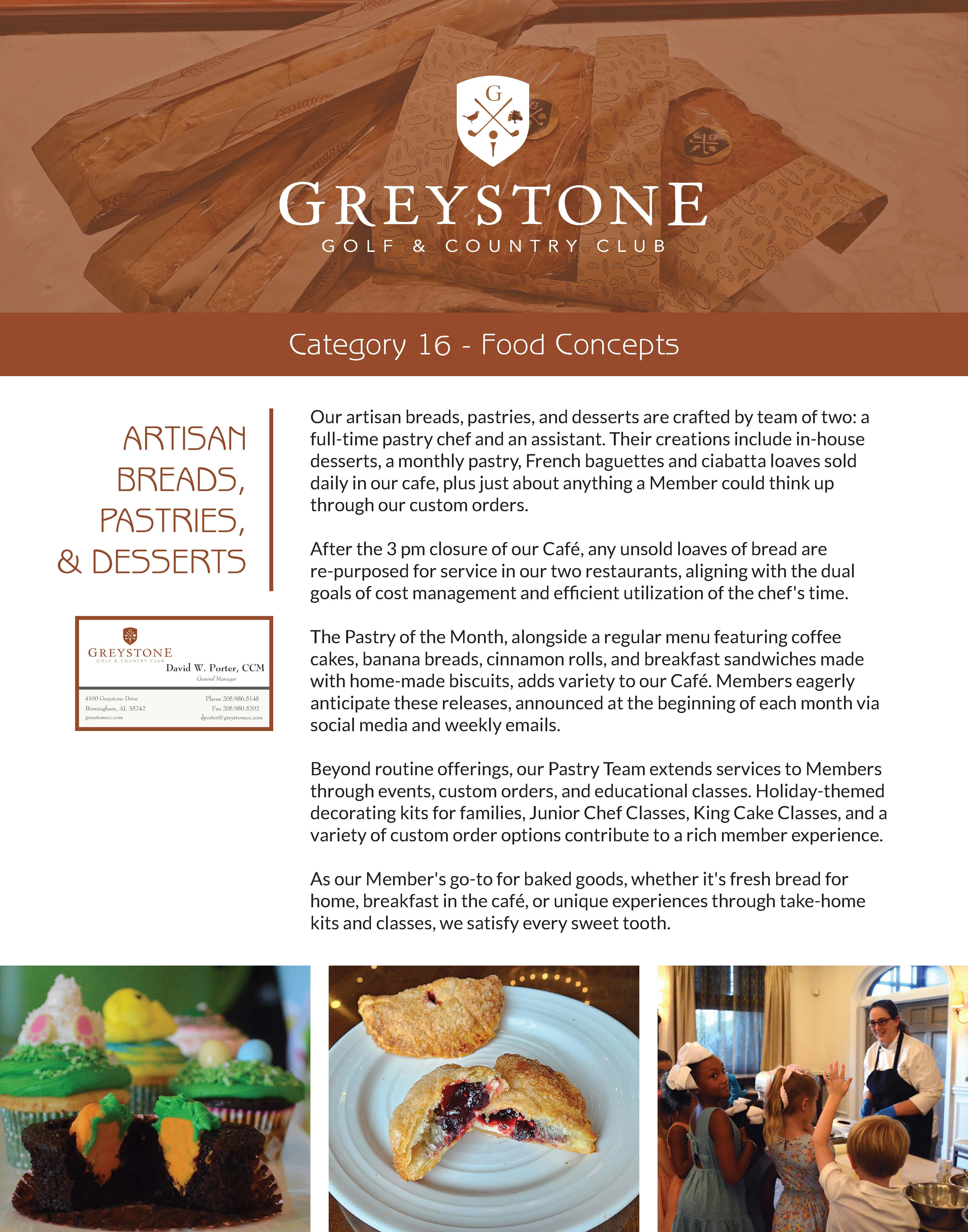 The pastry team has implemented this program by adding each new item individually. The bread is usually sold before 3 pm, and cookie and cupcake kits are very popular, especially when the kids are out of school. Mardi Gras King Cakes are becoming a Greystone Tradition whether the Member is taking the class or ordering whole cakes for carryout, or slices in the cafe. It is not unusual for Members to order desserts and cakes for gathering at their homes. Members enjoy having the ability to order baked goods from the Club.