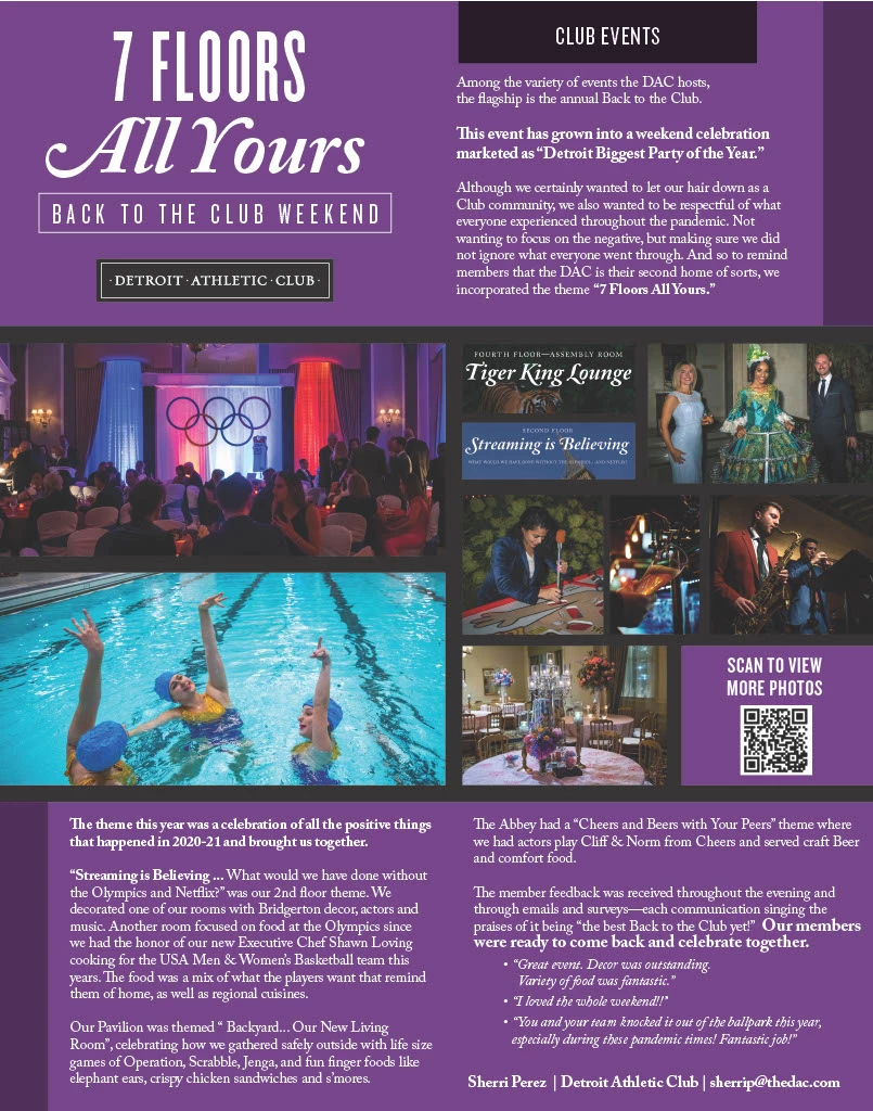 Among the variety of events the DAC hosts, the flagship is the annual Back to the Club. This event has grown into a weekend celebration marketed as “Detroit Biggest Party of the Year.” Although we certainly wanted to let our hair down as a Club community, we also wanted to be respectful of what everyone experienced throughout the pandemic. Not wanting to focus on the negative, but making sure we did not ignore what everyone went through. And so to remind members that the DAC is their second home of sorts, we incorporated the theme “7 Floors All Yours.”