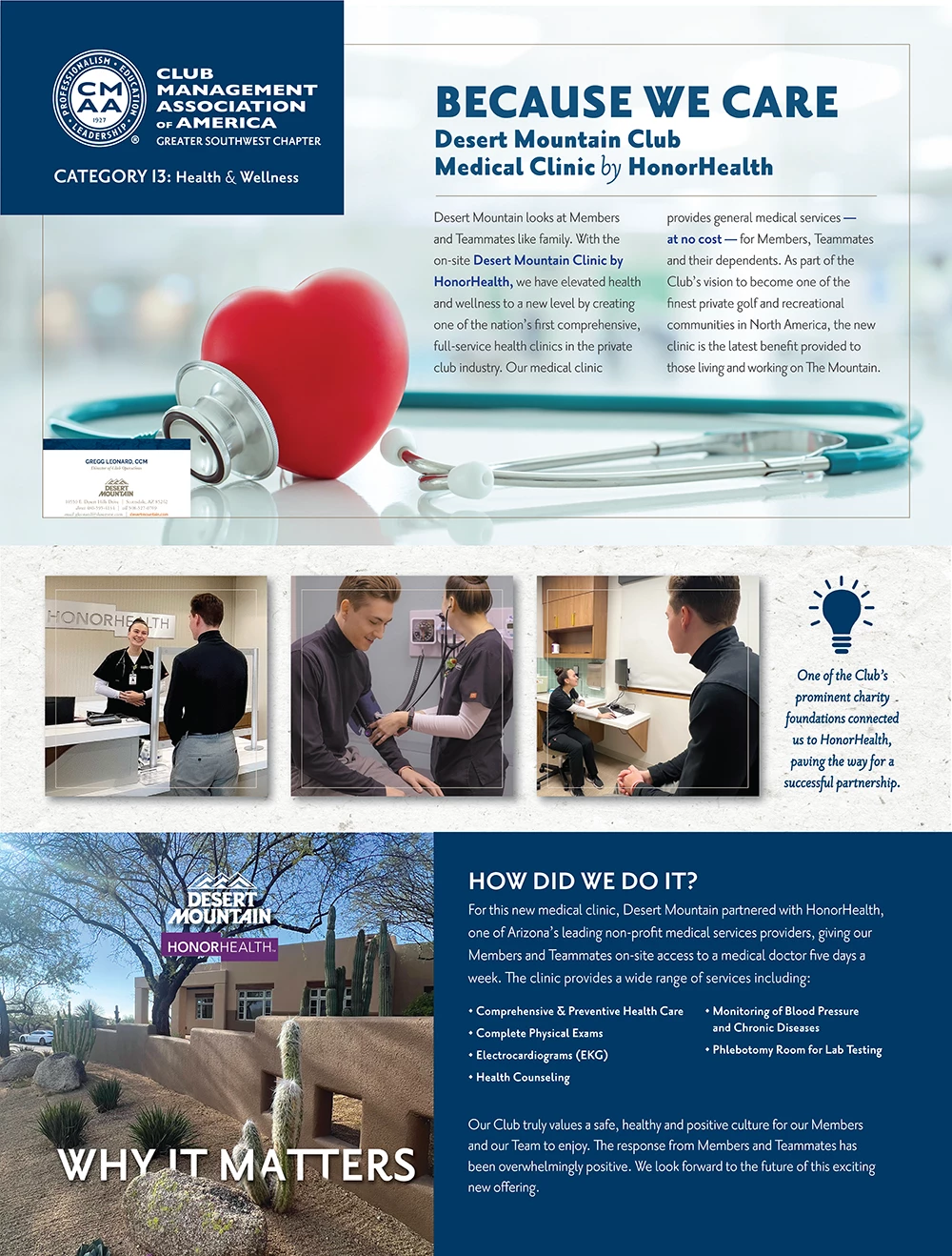 For this new medical clinic, Desert Mountain partnered with HonorHealth, one of Arizona's leading non-profit medical services providers, giving our Members and Teammates on-site access to a medical team and physician five days a week, free of charge. HonorHealth was introduced to us through one of the Club’s prominent foundations, paving the way for a successful local partnership. The clinic provides everything from complete physical exams to comprehensive and preventative health care, and from vaccinations to electrocardiograms (EKG) to wellness programs and screenings. There's even a Phlebotomy Room for lab testing--all on-site, all at no cost. Understandably, the response from Members and Teammates has been overwhelmingly positive.