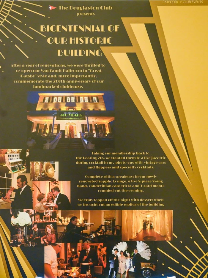 To commemorate the 200th anniversary of our landmarked Clubhouse after a year of renovations, we celebrated the re-opening in "Great Gatsby" style. Celebrating the historical significance of our Clubhouse has instilled a greater sense of pride that was always there, just not at the forefront. Members were encouraged to explore and tour the entire Clubhouse. Floorplans were distributed to Members as all 17,000 sq feet of the building was used as well as the front porch and lawn for the cocktail hour. Each room of the mansion had something unique, whether it was the speakeasy or the professional movie props that were rented to create photo opportunities.