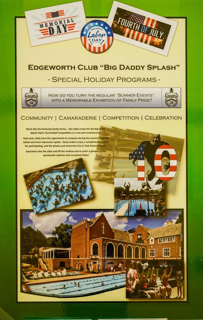 The Big Daddy Splash is the ideal campfire which members come by to warm their hands and build community. Dads compete for the tallest cannonball splash to the amazement of a full pool on the Club's major pool holidays: Memorial Day, July 4th, and Labor Day. Much like the Kentucky Derby series, a triple crown is announced on rare occasion when one Dad takes all three contests in one year.