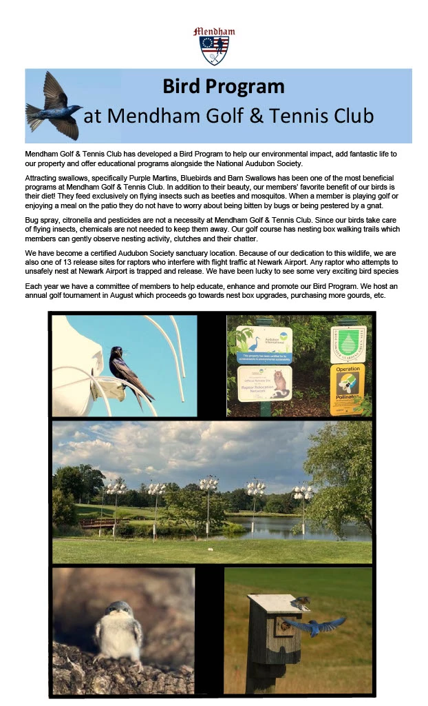 Attracting swallows, specifically Purple Martins, Bluebirds and Barn Swallows has been one of the most beneficial programs at Mendham Golf & Tennis Club. In addition to their beauty, our members’ favorite benefit of our birds is their diet! They feed exclusively on flying insects such as beetles and mosquitos. When a member is playing golf or enjoying a meal on our patio they do not have to worry about being bitten by bugs or being pestered by a gnat.