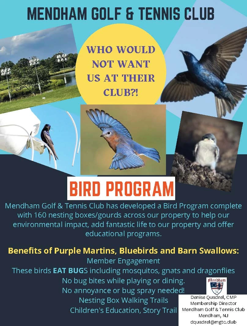 Mendham Golf & Tennis Club has developed a Bird Program complete with over 160 nesting areas to help our environmental impact, add fantastic life to our property and offer educational programs.
