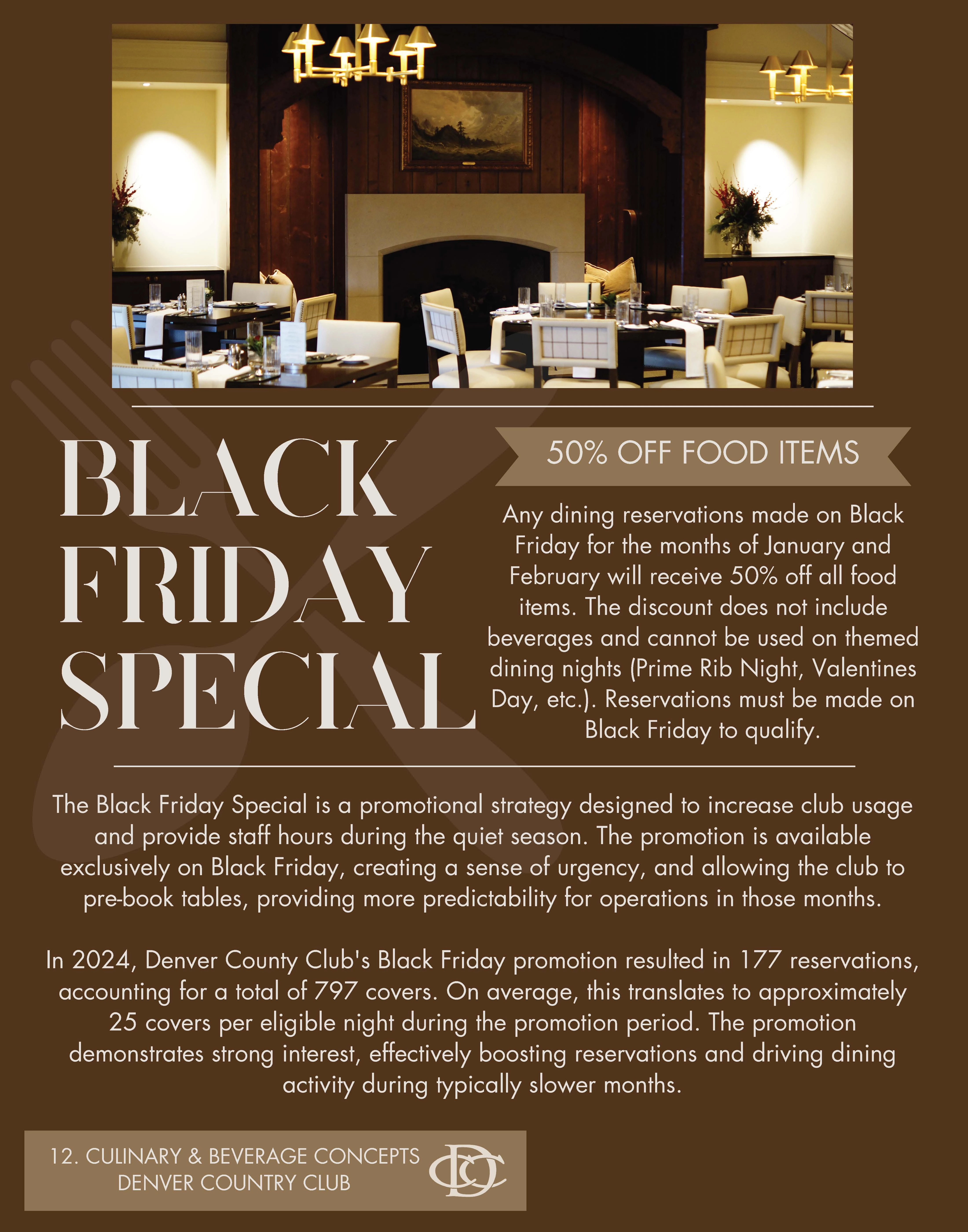 Members may make a reservation on black Friday for a night in January or February (excluding special themed nights and holidays) for 50% of the food in their meal. This promotion does not include beverages. The promotion was so successful in 2023 (reservations made for Jan 2024) we added non-holiday/themed nights in February to the 2024 promotion (reservations made for Jan/Feb 2025). In 2023 we averaged 30 covers per night, but the number of eligible nights were fewer. In 2024, Denver County Club's Black Friday promotion resulted in 177 reservations, accounting for a total of 797 covers. On average, this translates to approximately 25 covers per eligible night during the promotion period. The promotion demonstrates strong interest, effectively boosting reservations, driving dining activity and providing staff hours during typically slower months.