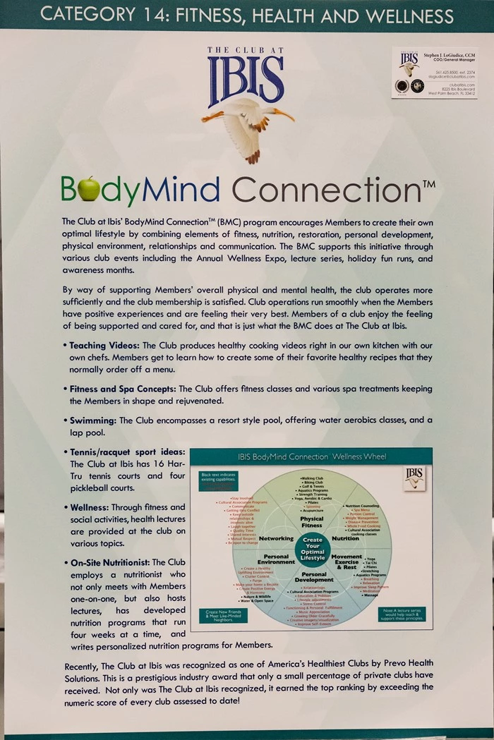 The Club at Ibis’ BodyMind ConnectionTM (BMC) program encourages Members to create their own optimal lifestyle by combining elements of fitness, nutrition, restoration, personal development, physical environment, relationships and communication. The BMC supports this initiative through various club events including the Annual Wellness Expo, lecture series, holiday fun runs, and awareness months.