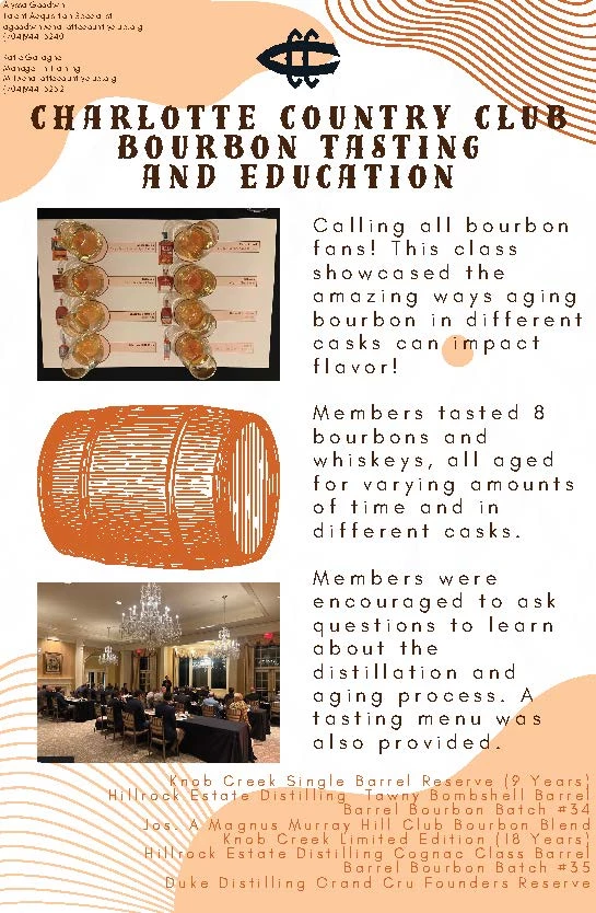 Members tasted 8 bourbons and whiskeys, all aged for varying amounts of time and in different casks. Members were encouraged to ask questions to learn about the distillation and aging process. A tasting menu was also provided.