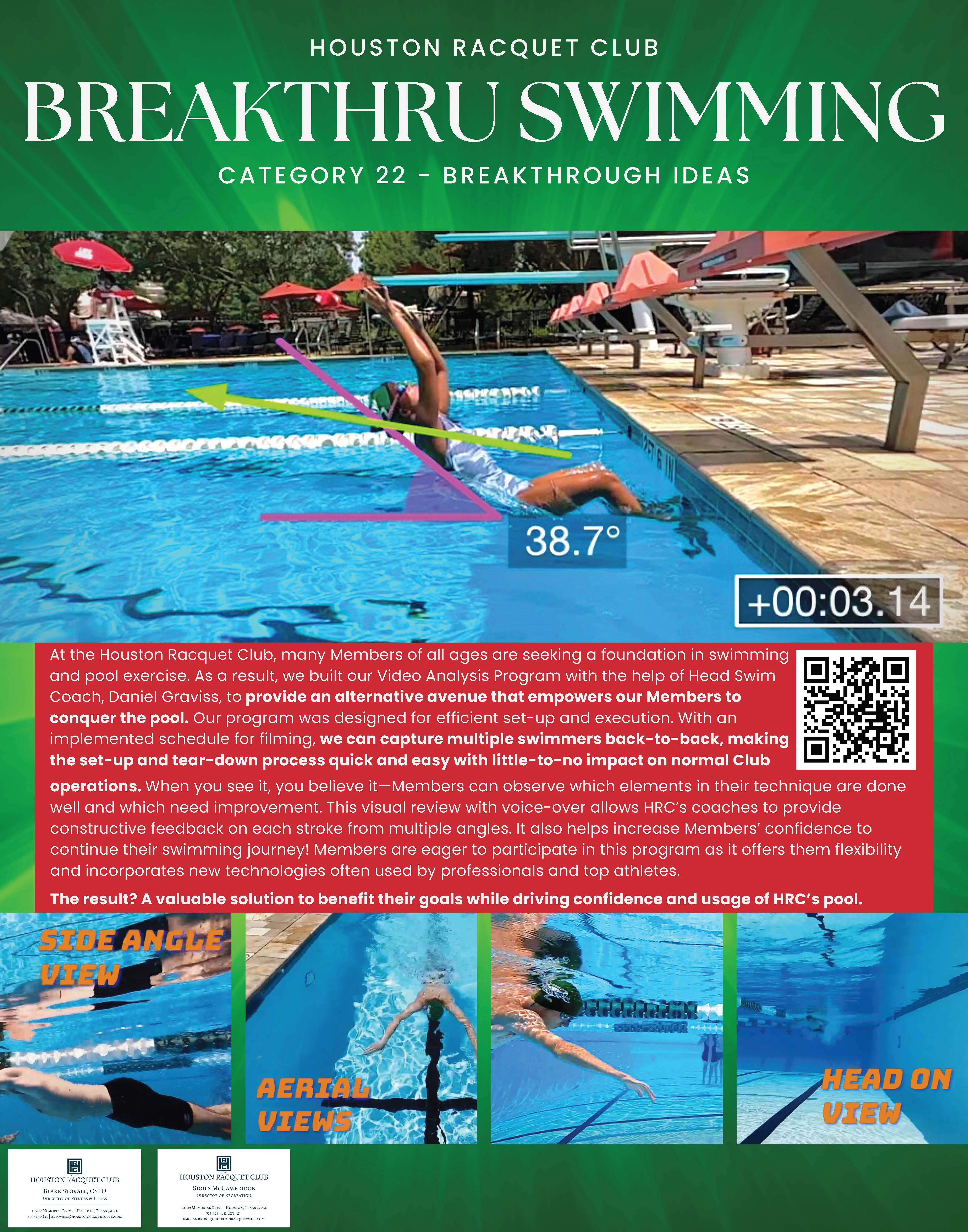 At Houston Racquet Club, many Members of all ages are seeking a foundation in swimming and pool exercise. As a result, we built our Video Analysis Program with the help of Head Swim Coach, Daniel Graviss, to provide an alternative avenue that empowers our Members to conquer the pool.