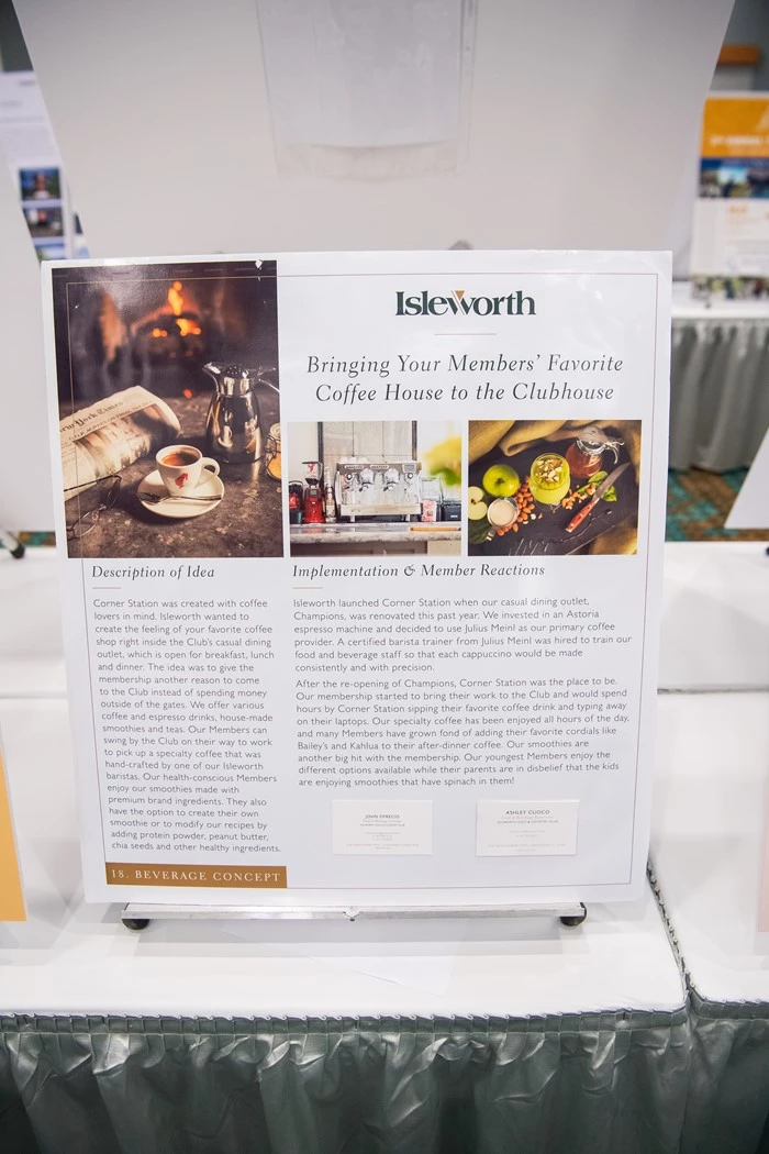 Isleworth launched Corner Station when our casual dining outlet, Champions, was renovated this past year. We invested in an Astoria espresso machine and decided to use Julius Meinl as our primary coffee provider. A certified barista trainer from Julius Meinl was hired to train our food and beverage staff so that each cappuccino would be made consistently and with precision. After the re-opening of Champions, Corner Station was the place to be. Our membership started to bring their work to the Club and would spend hours by Corner Station sipping their favorite coffee drink and typing away on their laptops. Our specialty coffee has been enjoyed all hours of the day, and many Members have grown fond of adding their favorite cordials like Bailey’s and Kahlua to their after-dinner coffee. Our smoothies are another big hit with the membership. Our youngest Members enjoy the different options available while their parents are in disbelief that the kids are enjoying smoothies that have spinach in them!