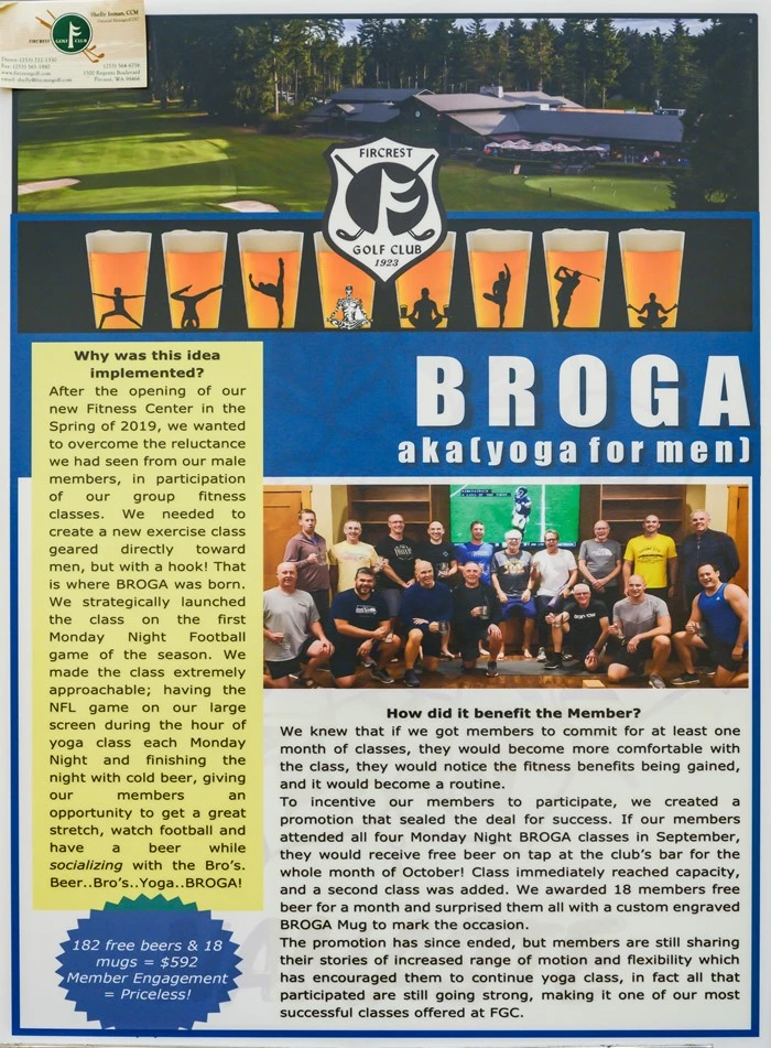 We created BROGA -Yoga for Bro's...with Beer! What better way to entice than to have a Monday Night Yoga Class that has Monday Night Football playing on the yoga room big screen and have craft beers after to encourage socializing. We went a step further and upped the ante -anybody who attends all Mondays in September, get as much free tap beer as they can drink in the bar for the month of October. Class hit capacity immediately, a second class was added and 18 members received free beer in October. All 18 are still participating in Broga and we broke through the barrier of having Men join group fitness.