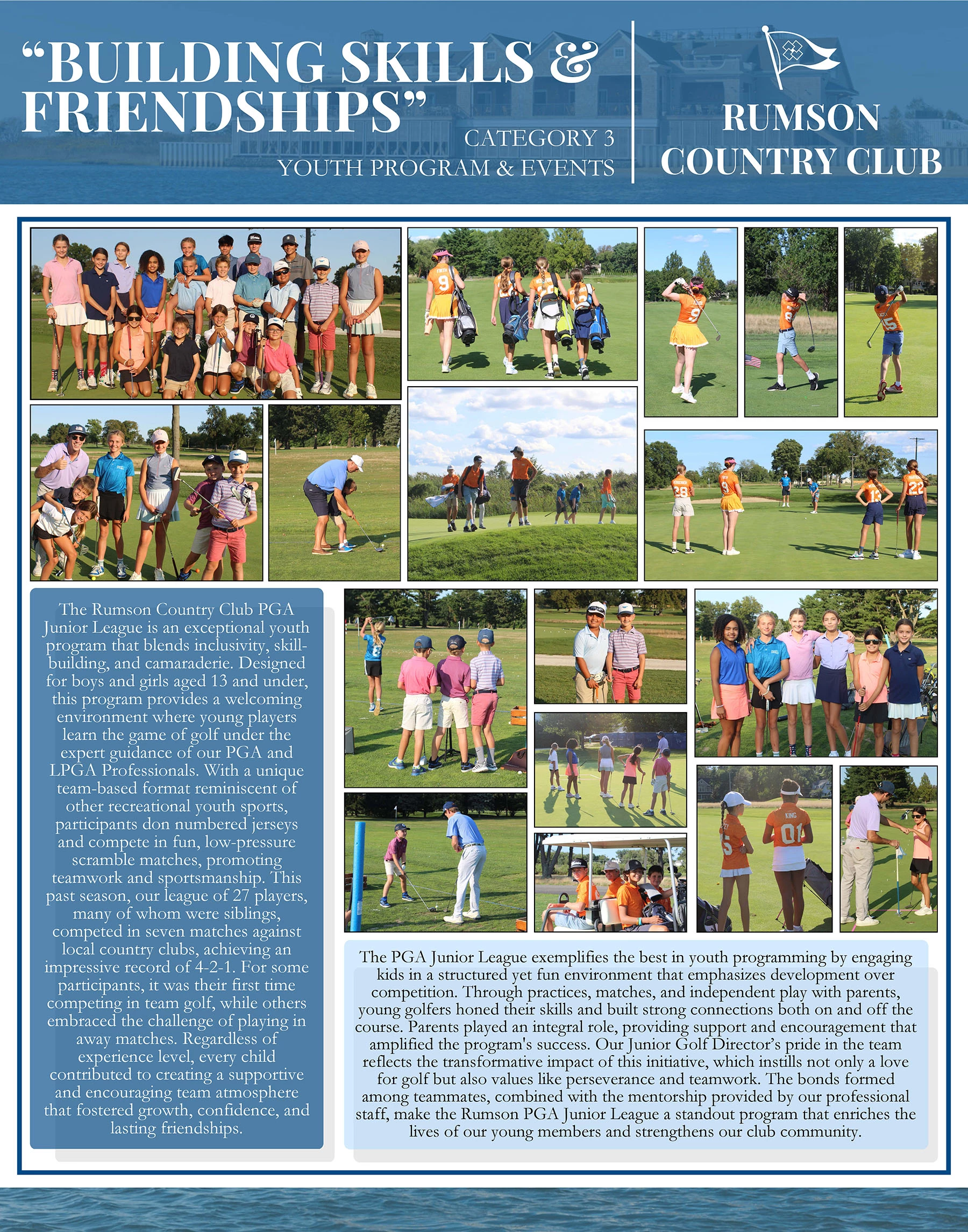 The PGA Junior League exemplifies the best in youth programming by engaging kids in a structured yet fun environment that emphasizes development over competition. Through practices, matches, and independent play with parents, young golfers honed their skills and built strong connections both on and off the course. Parents played an integral role, providing support and encouragement that amplified the program's success. Our Junior Golf Director’s pride in the team reflects the transformative impact of this initiative, which instills not only a love for golf but also values like perseverance and teamwork. The bonds formed among teammates, combined with the mentorship provided by our professional staff, make the Rumson PGA Junior League a standout program that enriches the lives of our young members and strengthens our club community.
