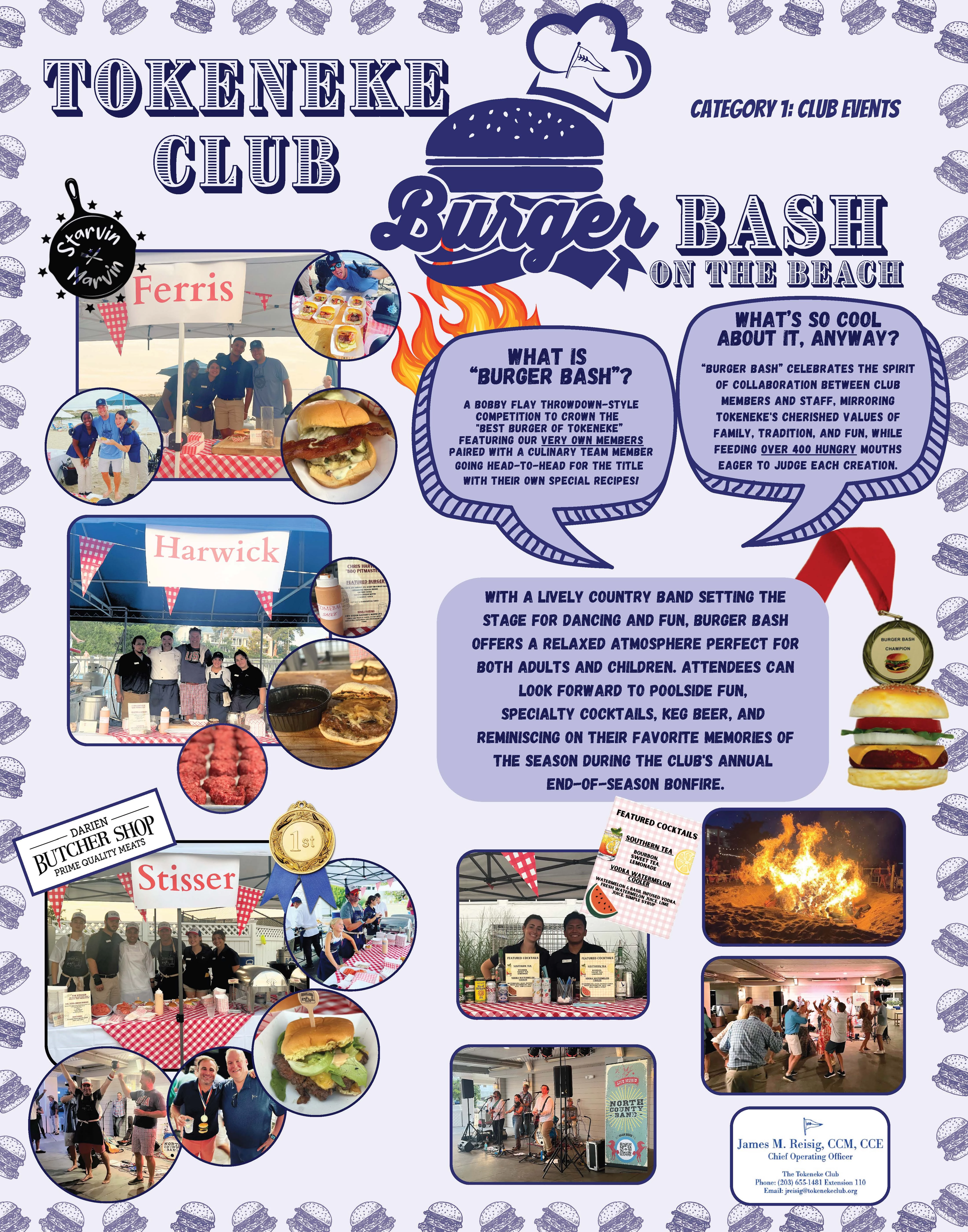 The Burger Bash on the Beach is a Bobby Flay Throwdown-Style Competition to Crown the "Best Burger of Tokeneke”. Three club members get paired with a Culinary team member and front of house staff to help execute their vision and recipe to be judged for "Best Burger" by other club members. This event not only exemplifies the values of family, tradition, and fun among member families but allows for comradery between club members and staff as they had the opportunity to plan their burger with a culinary team member, tackle any operational challenges that came about throughout the event, and keep up with the demand for burgers!