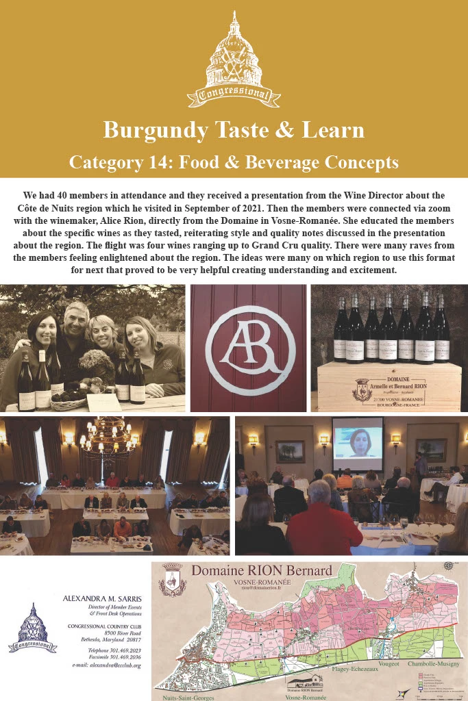 We been fortunate to grow our wine list to 600+ selections, with Burgundy as a prominent and popular section in two different restaurant outlets. While we have a team comprised of individuals experiencing wine education on the sommelier track to guide dining decisions, many members have requested to learn more about their selections, with a theme of appreciating (but not understanding) Burgundy. When we chose to host this specific event, it allowed for members to increase not only knowledge and education about the wine, but excited for them to order wines of higher quality at the Club. Our Wine Director had just recently traveled to the region, which allowed for special insight and a direct connection to winemakers in the region who were able to Zoom live during the event.