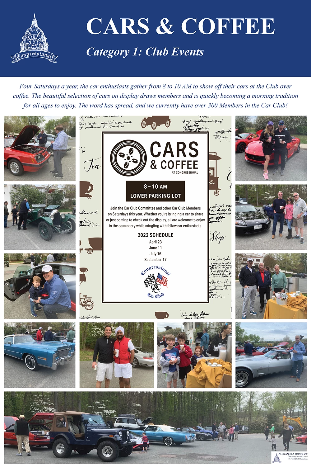 The idea for Cars & Coffee was borrowed after the local locations were no longer available for meetings. A few Congressional Car Club Committee Members mentioned how disappointed they were by this and thus Cars & Coffee at Congressional began. Four Saturdays a year, the car enthusiasts gather from 8 to 10 AM to show off their cars at the Club over coffee.