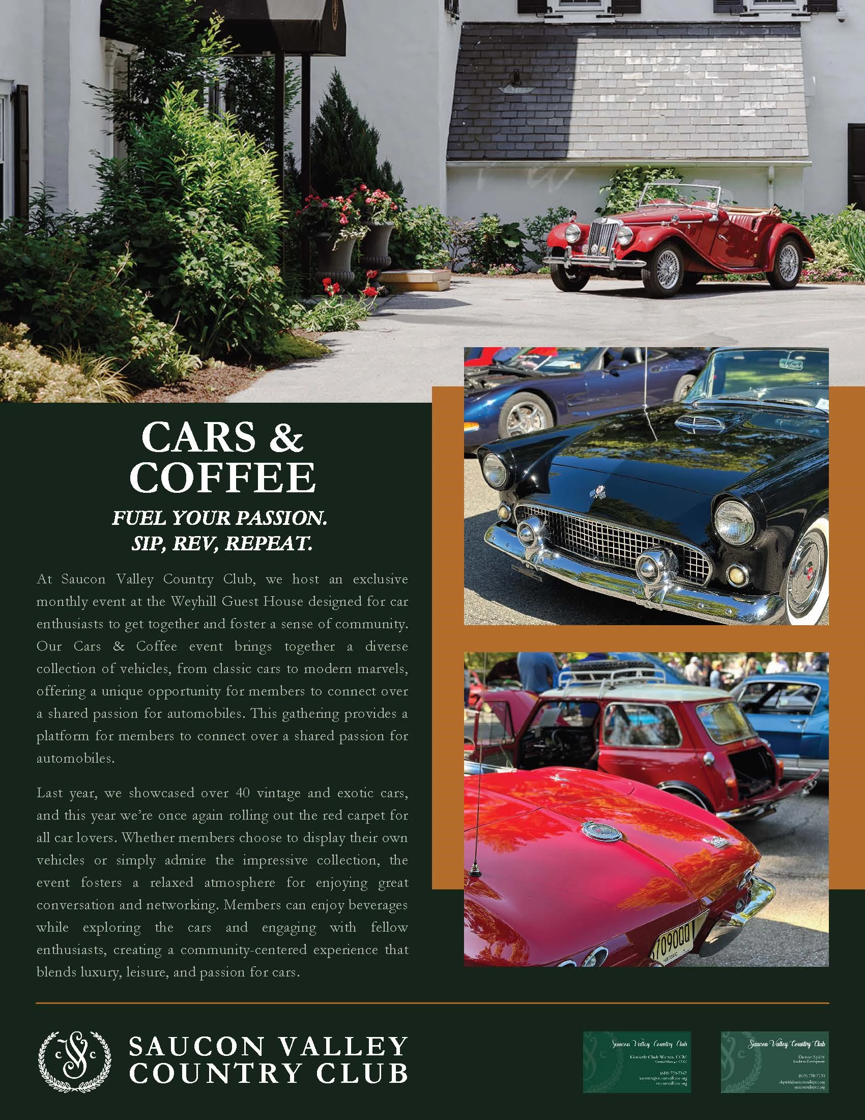The idea for Cars & Coffee was implemented by our Weyhill Guest House Committee with the goal of creating a casual yet engaging event that would appeal to car enthusiasts among our membership. We saw an opportunity to offer a unique gathering that would allow members to showcase their cars, connect with like minded individuals, and enjoy a relaxed social atmosphere. The members' reactions have been overly positive with many expressing how much they appreciate the opportunity to showcase their vehicles in a low pressure setting as well as connect with others who share a passion for cars.