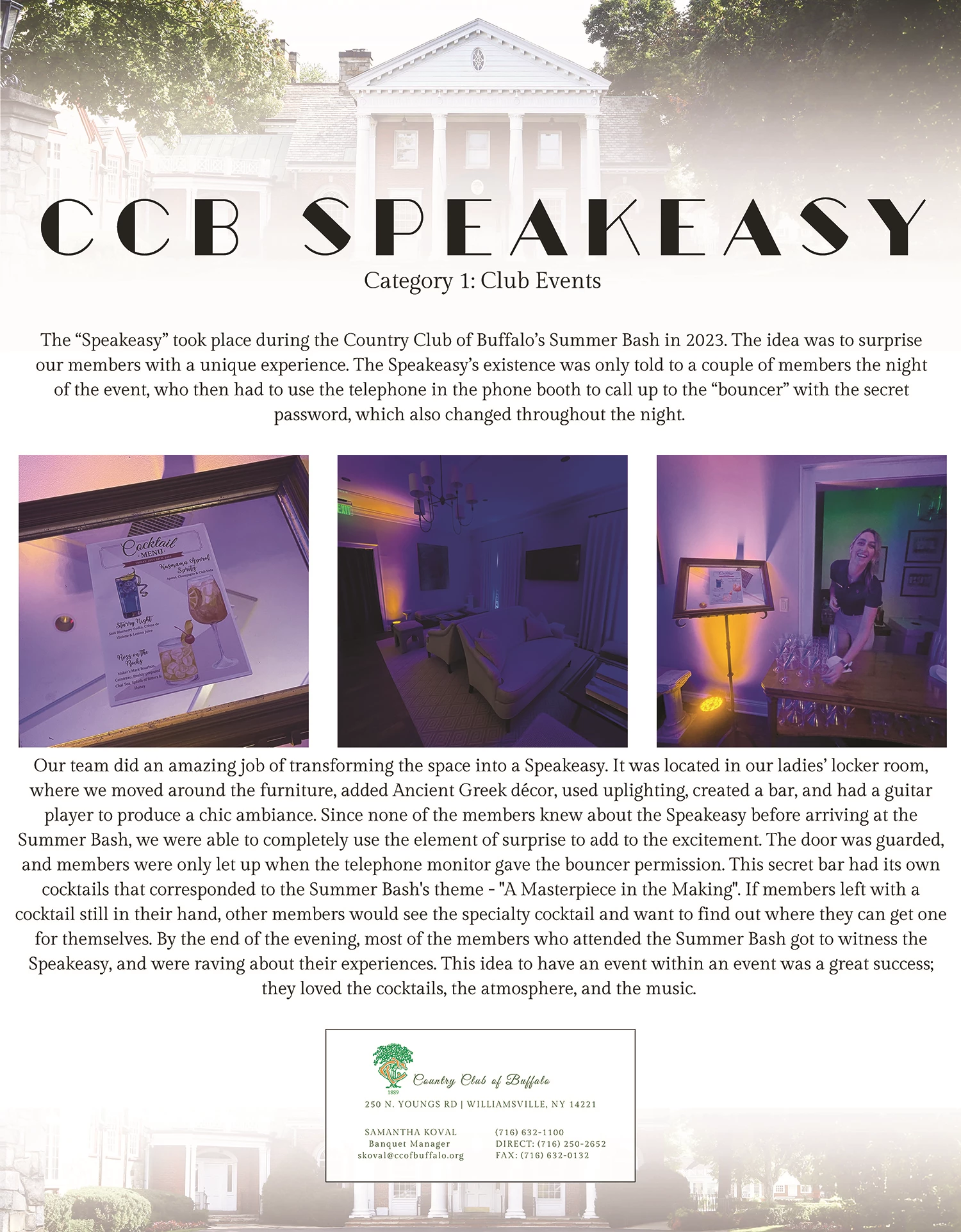 The “Speakeasy” took place during Country Club of Buffalo’s Summer Bash in 2023. The idea was to surprise our members with a unique experience. The “Speakeasy’s” existence was only told to a couple members the night of the event, who then had to use the telephone in the phone booth to call up to the “bouncer” with the secret password (which also changed throughout the night). It was then up to the members to spread the word. Due to the capacity limit on the space, we could only fit so many members in at a time, causing more excitement and even a line out the door.
