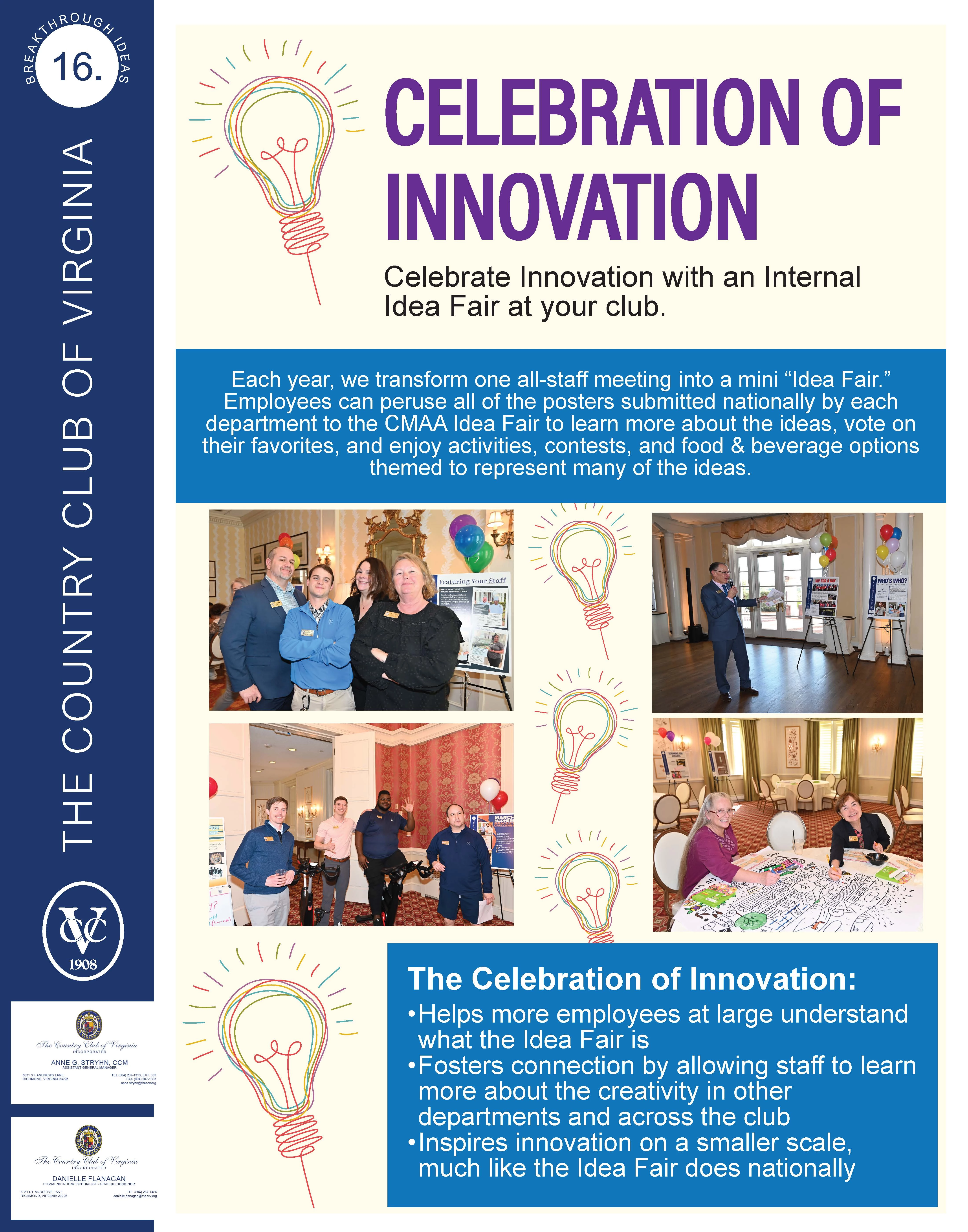 Celebrate Innovation with an Internal Idea Fair at your club! Each year, we transform one all-staff meeting into a mini “Idea Fair.” Employees can peruse all of the posters submitted nationally by each department to the CMAA Idea Fair to learn more about the ideas, vote on their favorites, and enjoy activities, contests, and food & beverage options themed to represent many of the ideas.