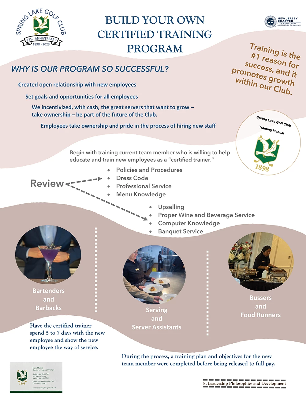 While the club was under renovation, our training process was reviewed and the idea of engaging our current staff in the training process was created. This provides direct involvement from the staff within the program. There has been nothing but positive comments from membership regarding our highest quality of service, and consistent dining experiences.