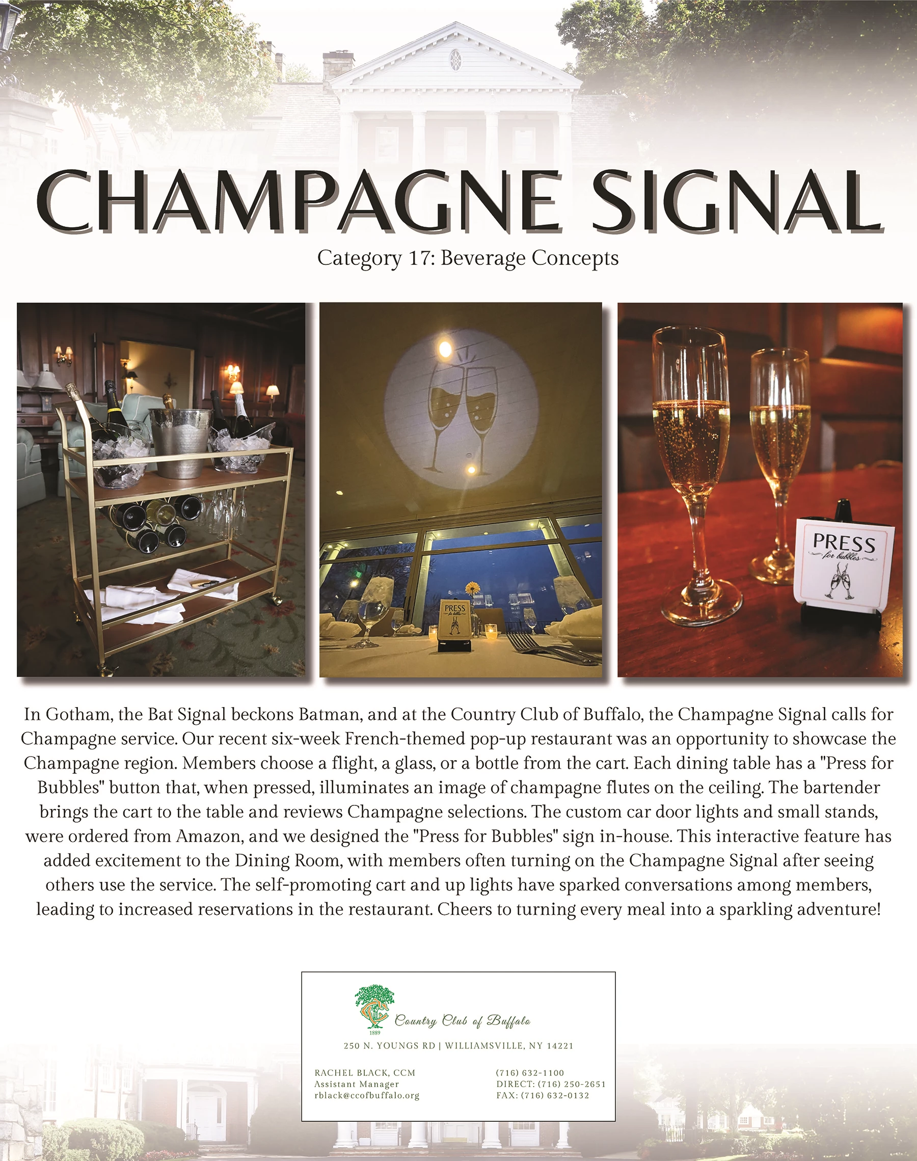 This ideas has been a great "plus one" to the pop up restaurant we run each year. It has generated buzz and increased reservations. It has also excited our team working in the restaurant. It has been fun to see two to three champagne signals on at a time each evening. Members cannot stop talking about it with friends and family. They're taking pictures and sending it to members of other clubs saying "look what we have." The bartender working the champagne cart each evening has done a great job learning the tasting notes on each bottle and selling flights so that members and guests can have a sampling of each.
