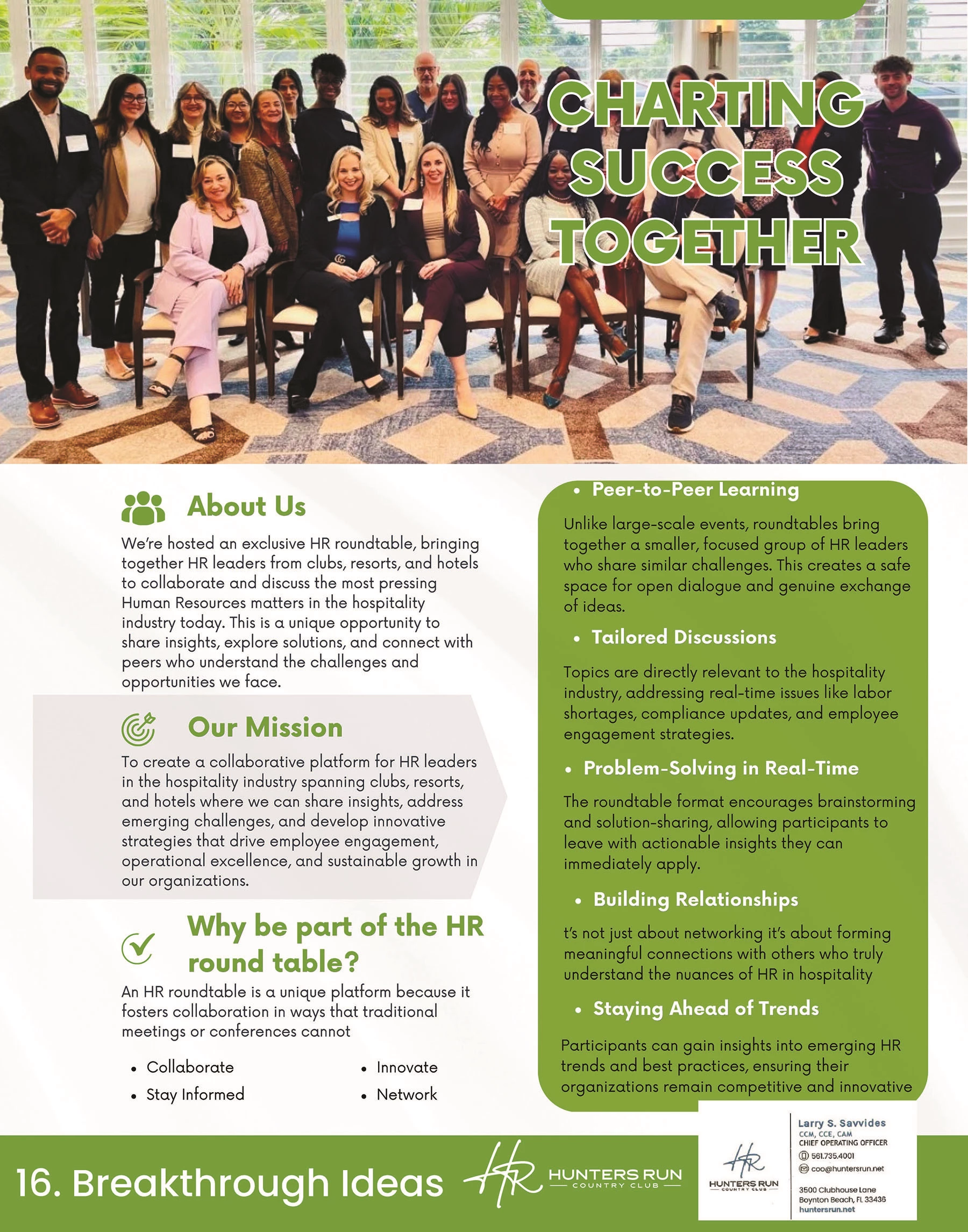 The HR Roundtable has greatly enhanced the club's operations by fostering a collaborative platform where HR leaders from clubs, resorts, and hotels can exchange insights and address common challenges. This initiative encourages innovation, real-time problem-solving, and strategic thinking, directly benefiting organizational growth and operational excellence. By creating a focused and safe space for tailored discussions, the roundtable format uniquely supports peer-to-peer learning and the development of actionable strategies, particularly in addressing industry-specific challenges like labor shortages, compliance updates, and employee engagement.
