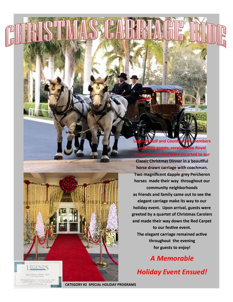 We set up a 15 ft. red carpet surrounded by gold brass stanchions with red velvet ropes. Behind was a pre-lit gold sparkle curtain surrounded by various Christmas trees. We hired a horse driven carriage who arrived several hours before the event to give the horses a chance to acclimate. Members were thrilled to see the magnificent horses, "Dennise & Jasper" and took the opportunity for a beautiful Christmas photo op.