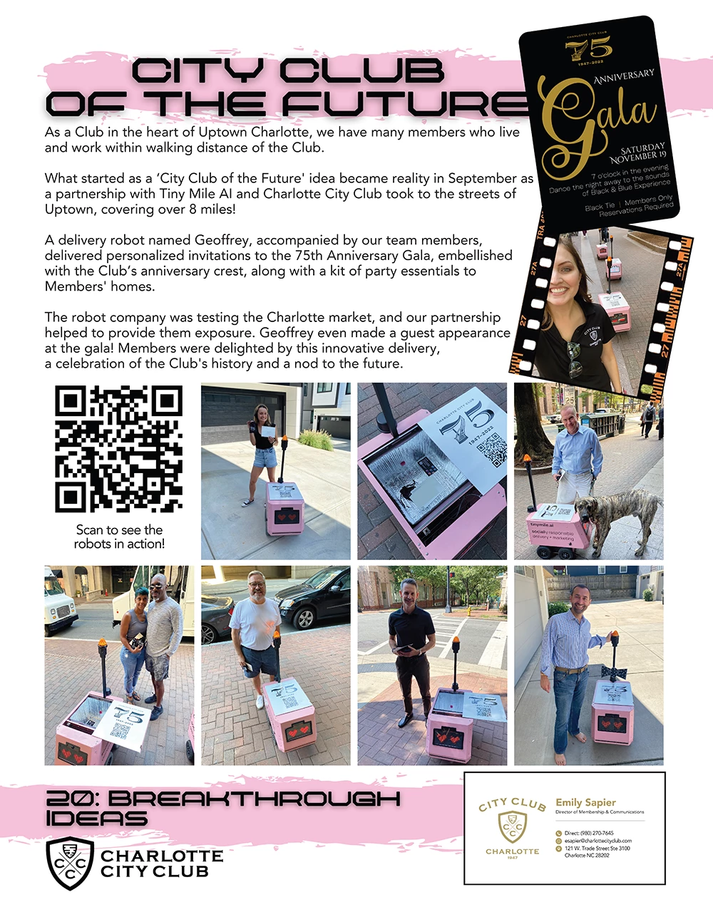 As a Club in the heart of Uptown Charlotte, we have many members who live and work within walking distance of the Club. While preparing the historic 75th-anniversary gala invitations for mailing, we wanted to have a 'wow' factor. We were inspired by the pink robots that recently popped up around Uptown. Members craved face-to-face contact more than ever and standard mail just isn't that engaging. What started as a ‘City Club of the Future' idea became reality in September as a partnership with Tiny Mile AI and Charlotte City Club took to the streets of Uptown, covering over 8 miles hand-delivering gala invitations!