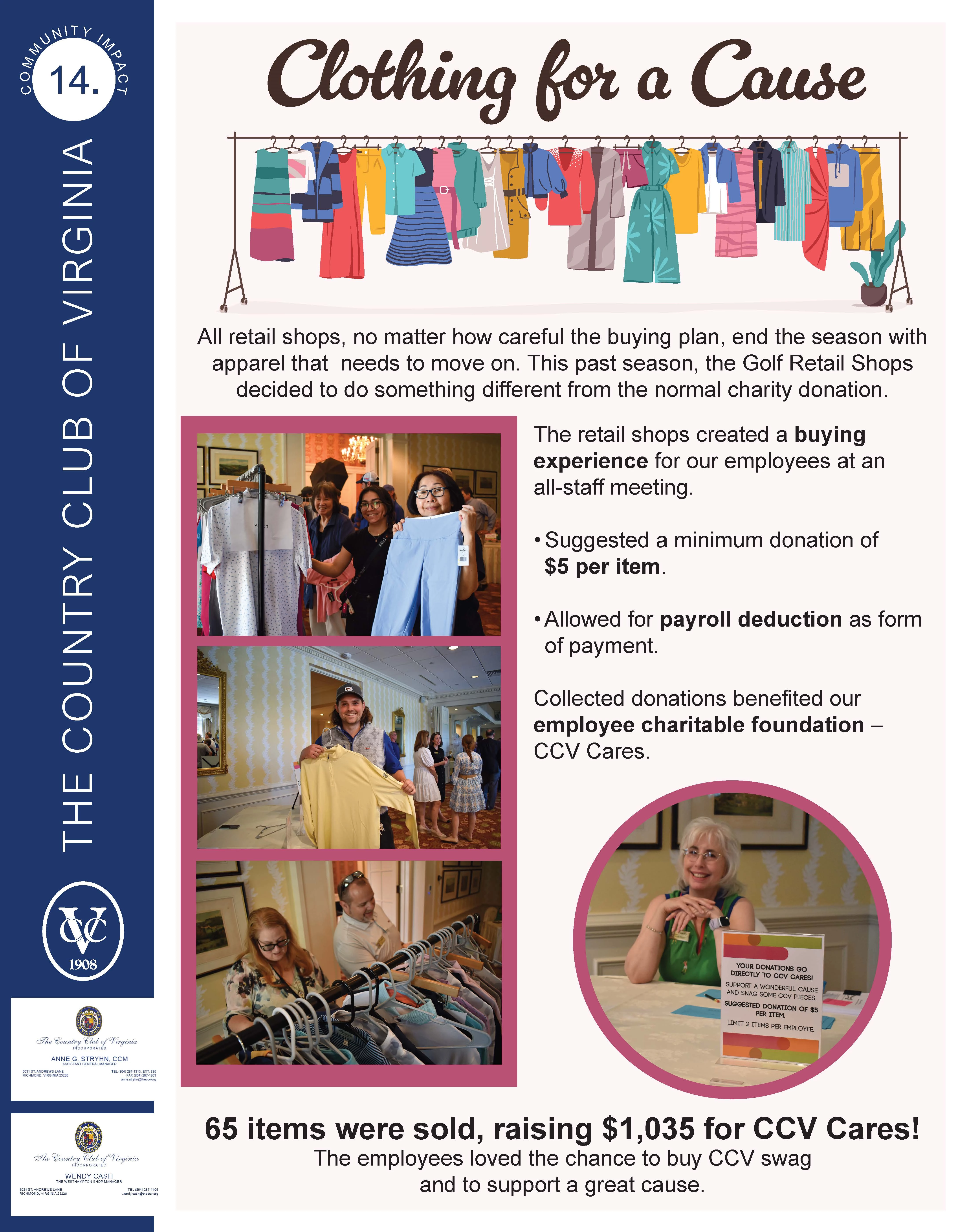 Our Retail Managers started "Clothes For A Cause." Normally, once an item has been on the sale rack over six months, it gets removed out of inventory and is donated to a thrift store. This year, those items were held until our next all-staff meeting and a ‘buying experience’ was created for all of the employees in attendance. The clothes could be bought with a minimum donation of $5.00 and could be payroll deducted. All monies went to CCV Cares, our employee assistance program with the mission of extending financial assistance to our co-workers and their immediate family members who suffer economic hardships arising from such unforeseen events as death, injury, illness, accident, natural disaster, or other personal or family emergency.