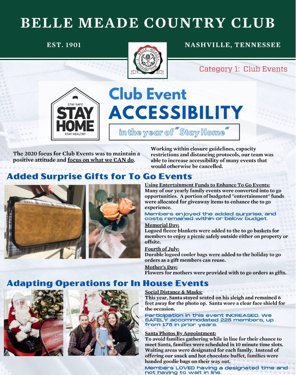 The club implemented these events on a case by case basis on what was feasible and what would be most closely associated with our members’ preferences. Annual events were amended to be enjoyed at home, outdoors, offsite or in a socially distanced format. The members were very happy and thankful for the access to these annual club events!