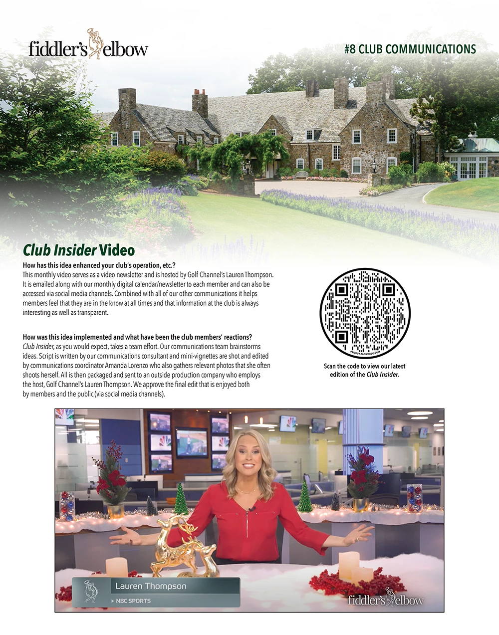 This monthly video serves as a video newsletter and is hosted by Golf Channel’s Lauren Thompson. It is emailed along with our monthly digital calendar/newsletter to each member and can also be accessed via social media channels. Combined with all of our other communications it helps members feel that they are in the know at all times and that information at the club is always interesting as well as transparent.