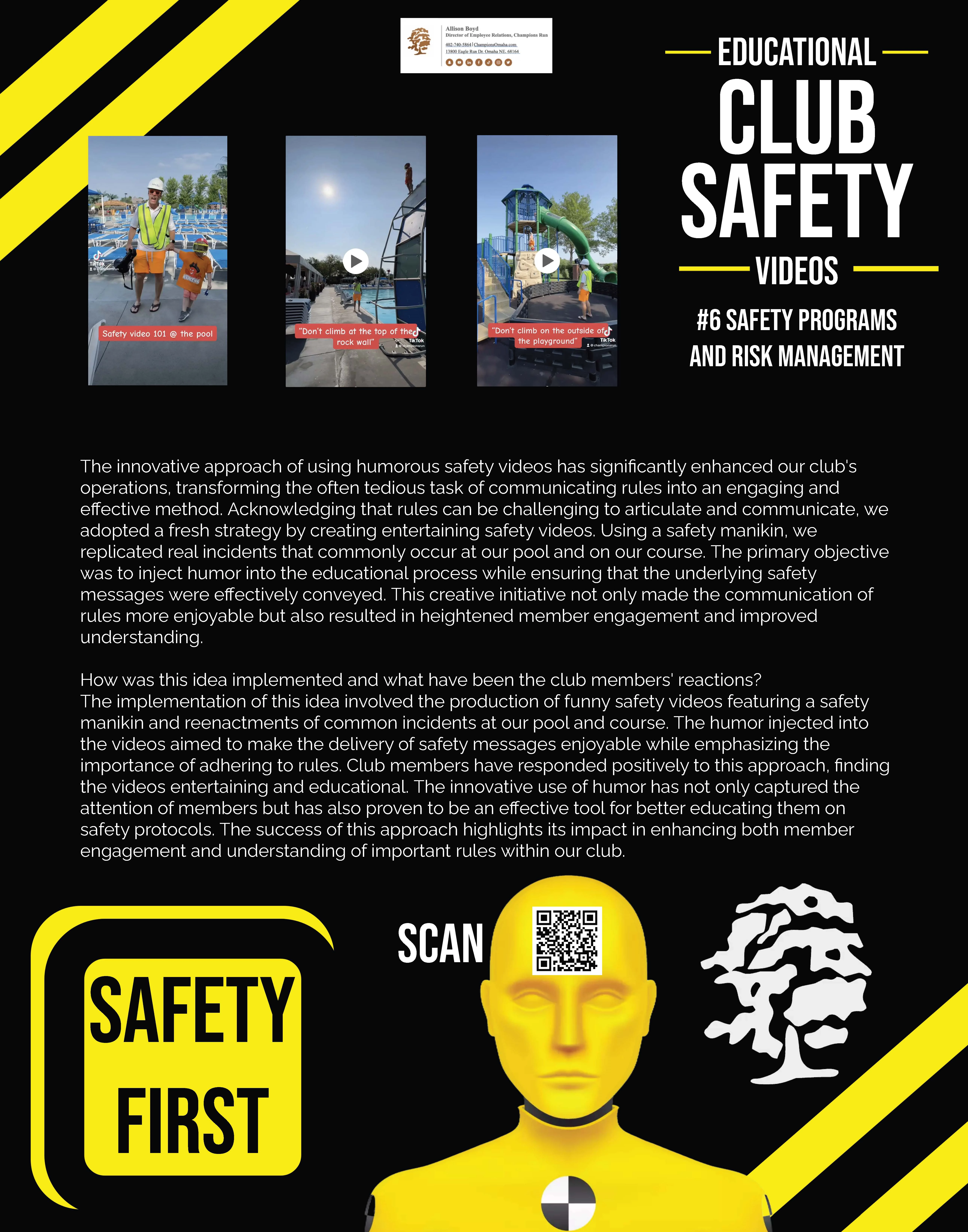 The implementation of this idea involved the production of funny safety videos featuring a safety manikin and reenactments of common incidents at our pool and course. The humor injected into the videos aimed to make the delivery of safety messages enjoyable while emphasizing the importance of adhering to rules. Club members have responded positively to this approach, finding the videos entertaining and educational. The innovative use of humor has not only captured the attention of members but has also proven to be an effective tool for better educating them on safety protocols. The success of this approach highlights its impact in enhancing both member engagement and understanding of important rules within our club.