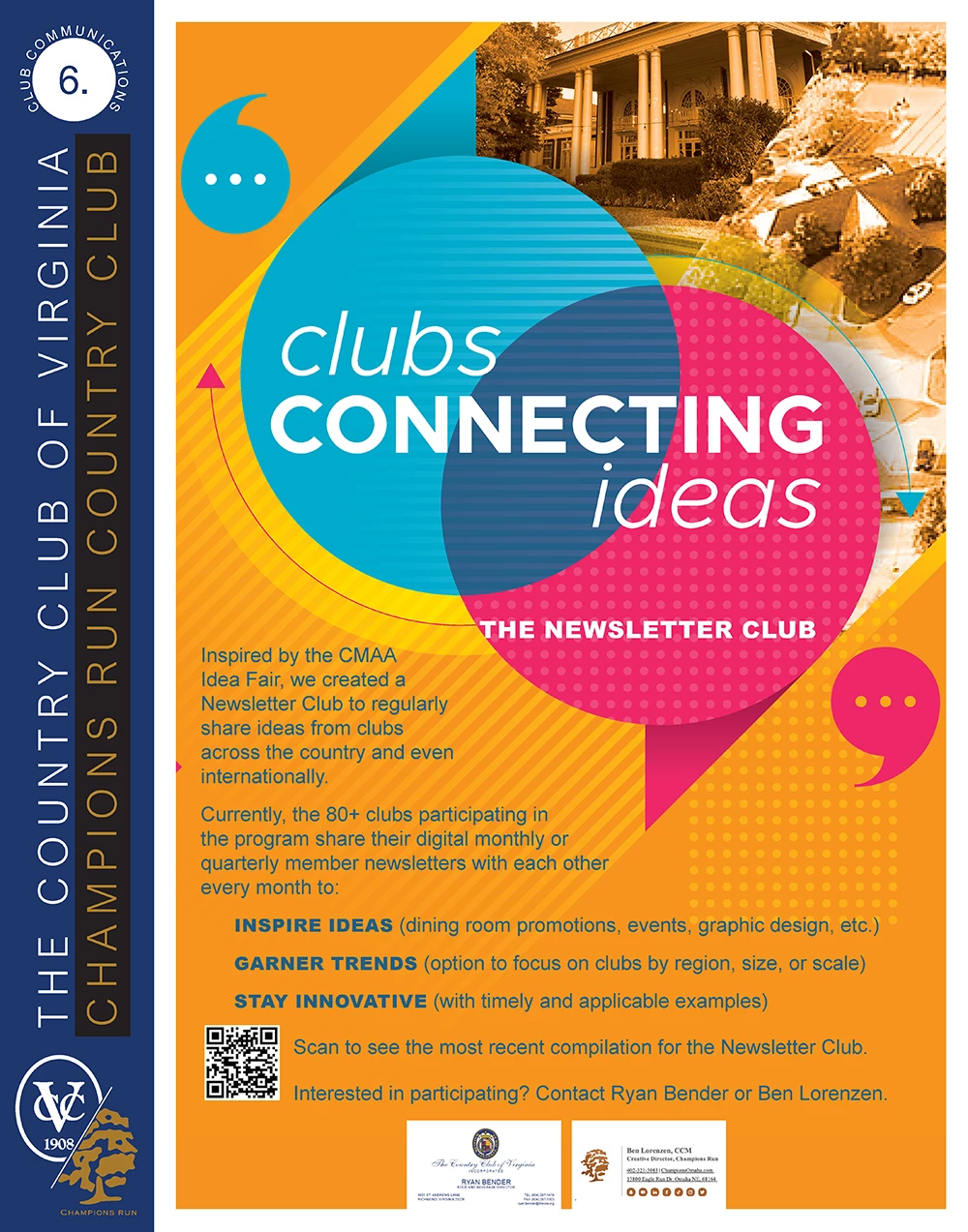 Currently, the 80+ clubs participating in the program share their digital monthly or quarterly member newsletters with each other every month to inspire ideas (dining room promotions, events, graphic design, etc.), garner trends, (option to focus on clubs by region, size, or scale), and stay innovative (with timely and applicable examples).