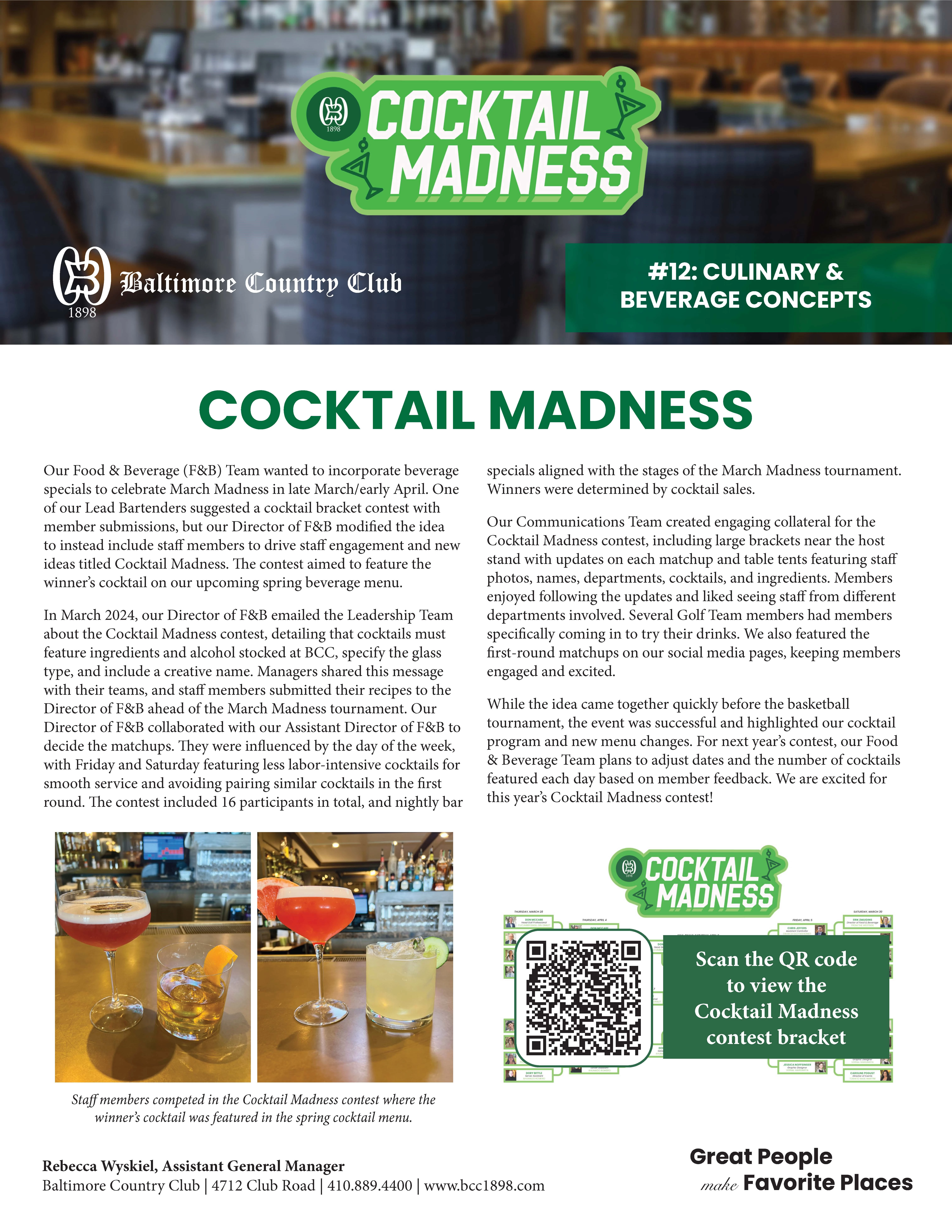 In March 2024, our Director of F&B emailed the Leadership Team about the Cocktail Madness contest, detailing that cocktails must feature ingredients and alcohol stocked at BCC, specify the glass type, and include a creative name. Managers shared this message with their teams, and staff members submitted their recipes to the Director of F&B ahead of the March Madness tournament. Our Director of F&B collaborated with our Assistant Director of F&B to decide the matchups. They were influenced by the day of the week, with Friday and Saturday featuring less labor-intensive cocktails for smooth service and avoiding pairing similar cocktails in the first round. The contest included 16 participants in total, and nightly bar specials aligned with the stages of the March Madness tournament. Winners were determined by cocktail sales.