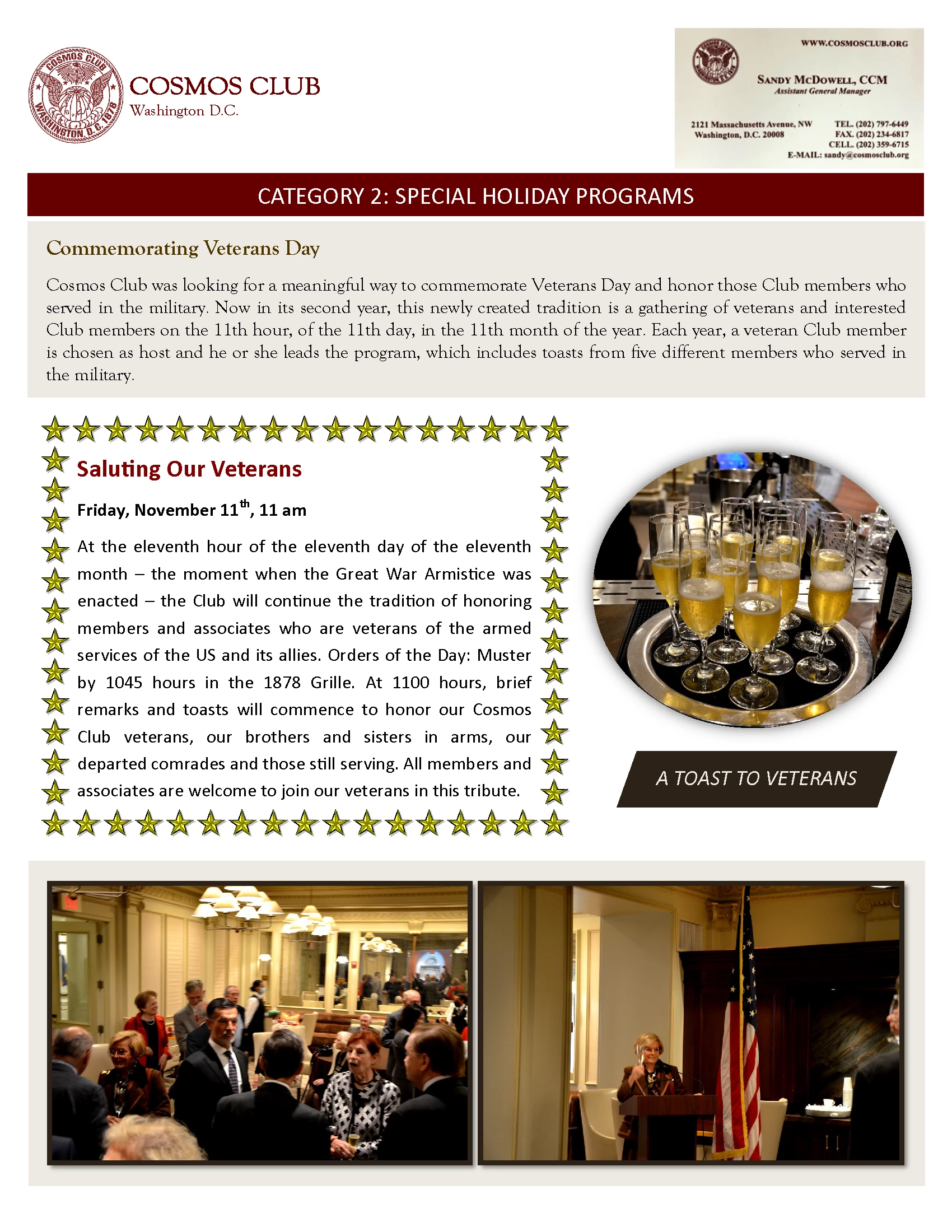 Cosmos Club was looking for a meaningful way to commemorate Veterans Day and honor those Club members who served in the military. Now in its second year, this newly created tradition is a gathering of veterans and interested Club members on the 11th hour of the 11th day in the 11th month of the year. Each year, a veteran Club member is chosen as host and he or she leads the program, which includes toasts from 5 different members who have served in the military.