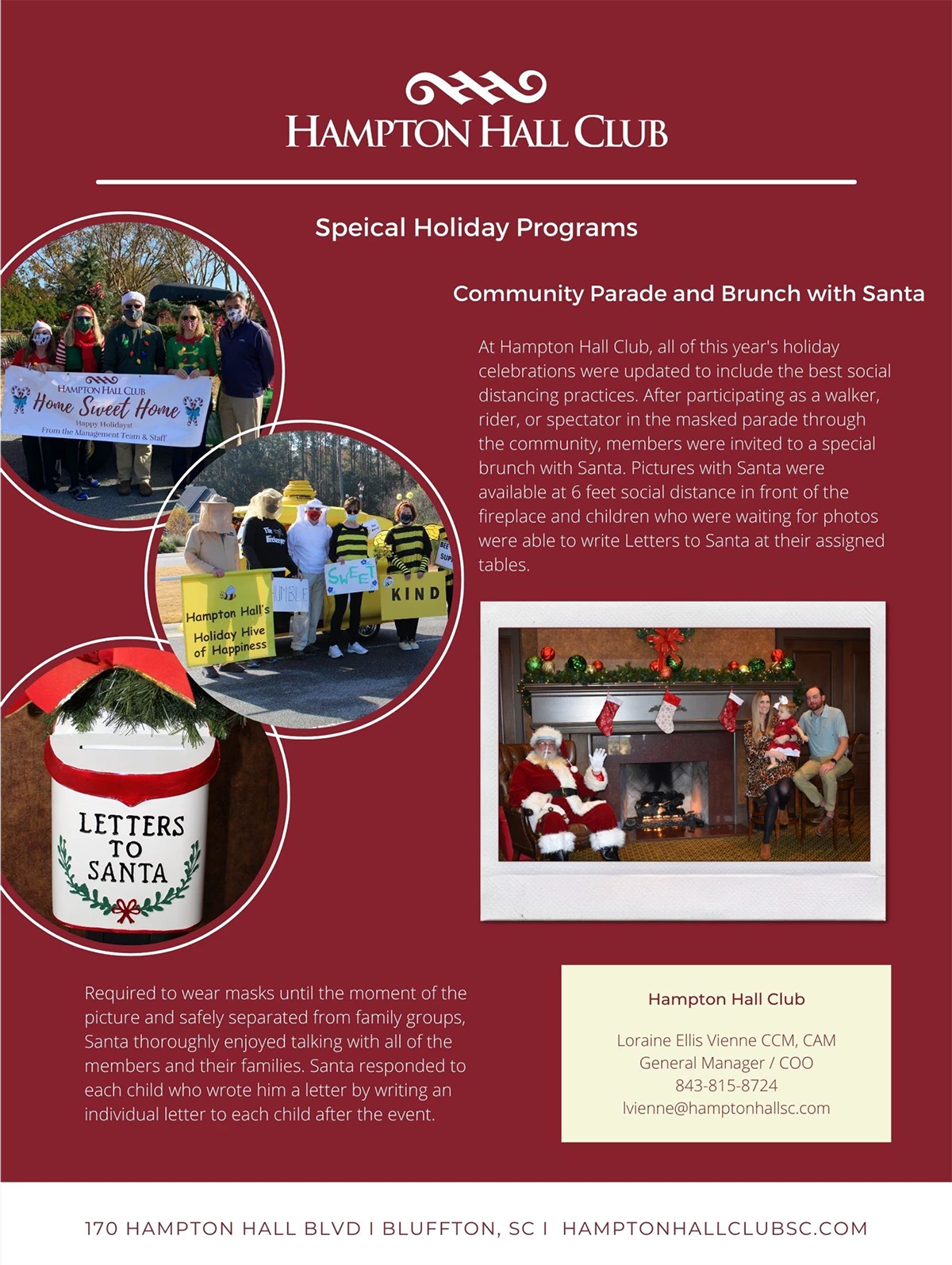 CAt Hampton Hall Club, all of this year's holiday celebrations were updated to include the best social distancing practices. After participating as a walker, rider, or spectator in the masked parade through the community, members were invited to a special brunch with Santa. Pictures with Santa were available at 6 feet social distance in front of the fireplace and children who were waiting for photos were able to write Letters to Santa at their assigned tables.