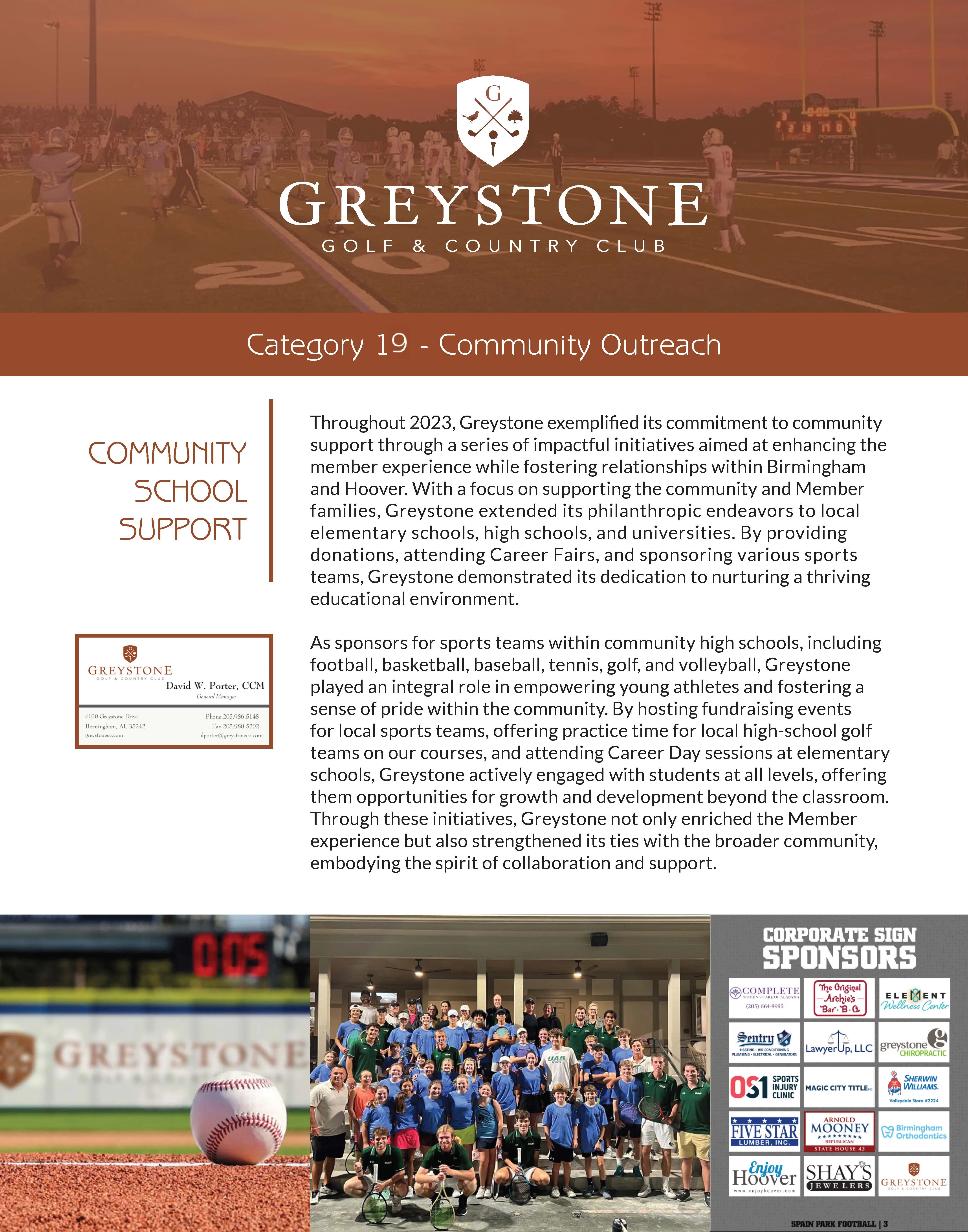 As sponsors for sports teams within community high schools, including football, basketball, baseball, tennis, golf, and volleyball, Greystone was integral in empowering young athletes and fostering a sense of pride within the community. By hosting fundraising events for local sports teams, offering practice time for local high-school golf teams on our courses, and attending Career Day sessions at elementary schools, Greystone actively engaged with students at all levels, offering the opportunities for growth and development beyond the classroom.