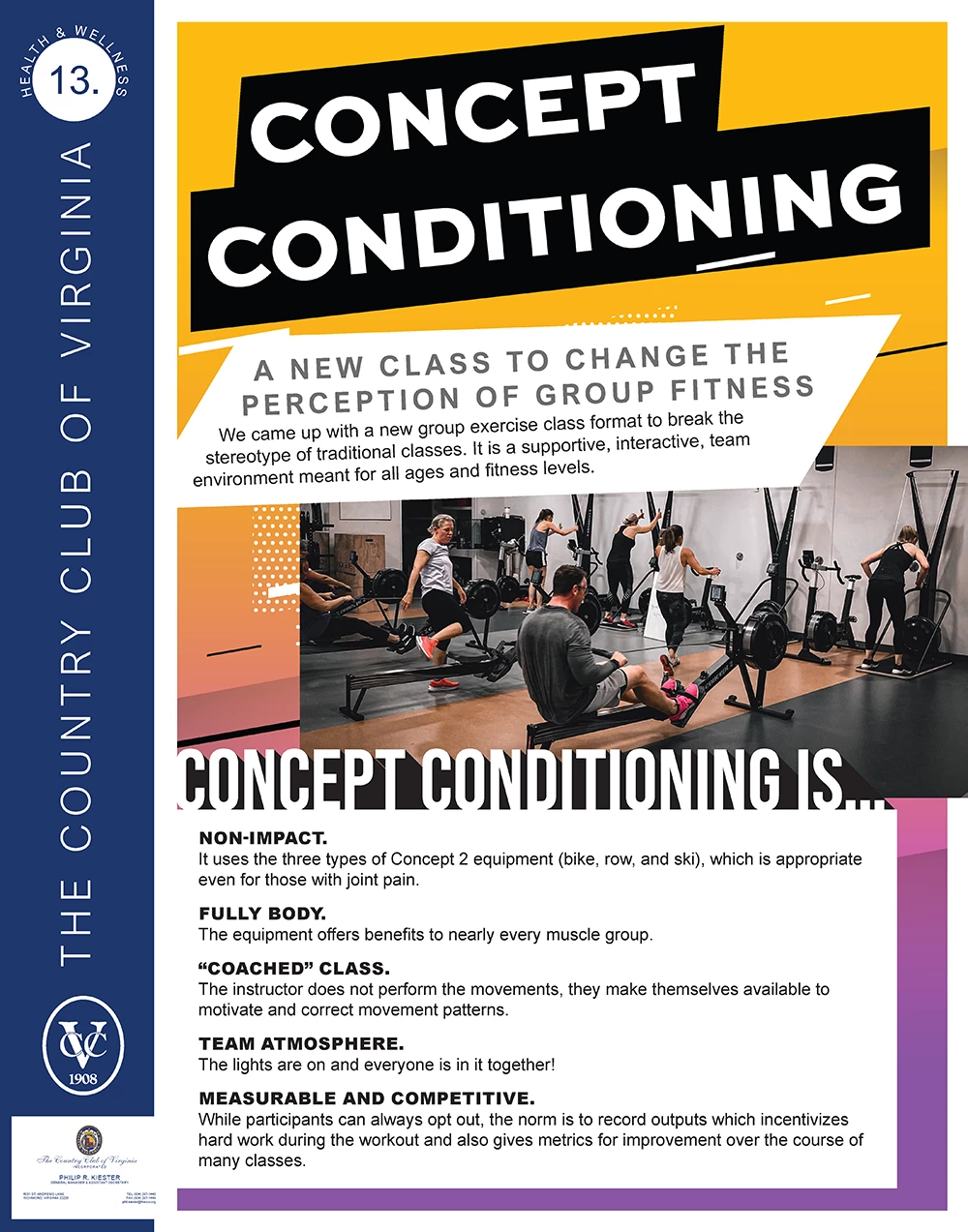 Enhancement to Club Operations: In the wake of COVID, when nearly every fitness enthusiast purchased a Peloton and home gym equipment, those returning to a gym setting were tired of biking and working out alone. Concept Conditioning offers a unique home for those looking to get intense cardiovascular exercise without the monotony of spinning, while connecting with others over the love of health and fitness. This new class format has allowed the Club to hire high energy instructors who would not otherwise teach typical group exercise classes.