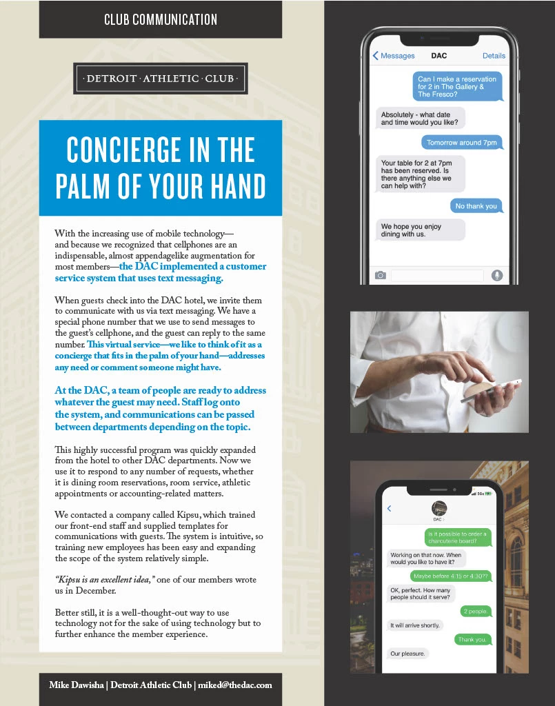 With the increasing use of mobile technology—and because we recognized that cellphones are an indispensable, almost appendagelike augmentation for most members—the DAC implemented a customer service system that uses text messaging. When guests check into the DAC hotel, we invite them to communicate with us via text messaging. We have a special phone number that we use to send messages to the guest’s cellphone, and the guest can reply to the same number. This virtual service—we like to think of it as a concierge that fits in the palm of your hand—addresses any need or comment someone might have.