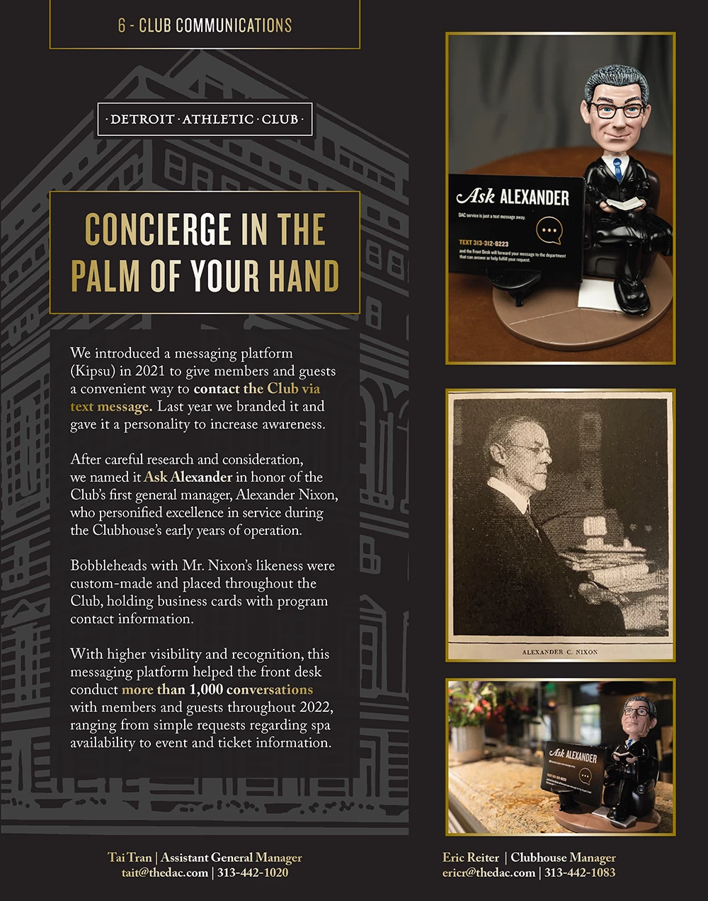 Named text messaging platform 'Ask Alexander' in honor of Alexander Nixon, the Club's first general manager. Created bobblehead business card holders resembling Nixon's likeness with cards for members/guests to take as reminder or reference.