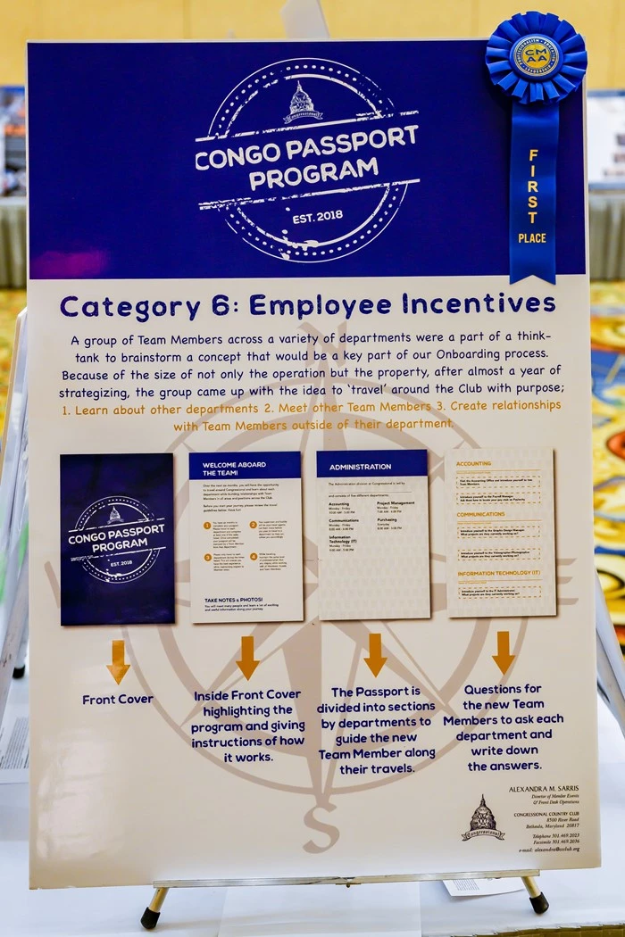 The passport program is part of our onboarding process. Our onboarding was only launched last October and was created using a think tank with team member from different divisions throughout the club to be able to get a vast amount of ideas in creating the program. We are very proud of our passport program; this unique idea has given our team members so much freedom to be able to “travel” throughout their club. Journey to any location within the club-- out to the Tennis House or out to the Green and Ground Building and learn about operations team members may not otherwise have exposure to. Aside from seeing the property and operation, it also has fostered outside department relationships. The idea of the passport program has driven engagement up almost 80%. Once the program was launched, we invited every single team member to take part in the program-- not just new team members. The team that was in place prior to the program launching were exited and reinvigorated for the opportunity to take part in the program, which also created a blend between employees that have been with us many years and those who had been at the Club for less than 90 days.