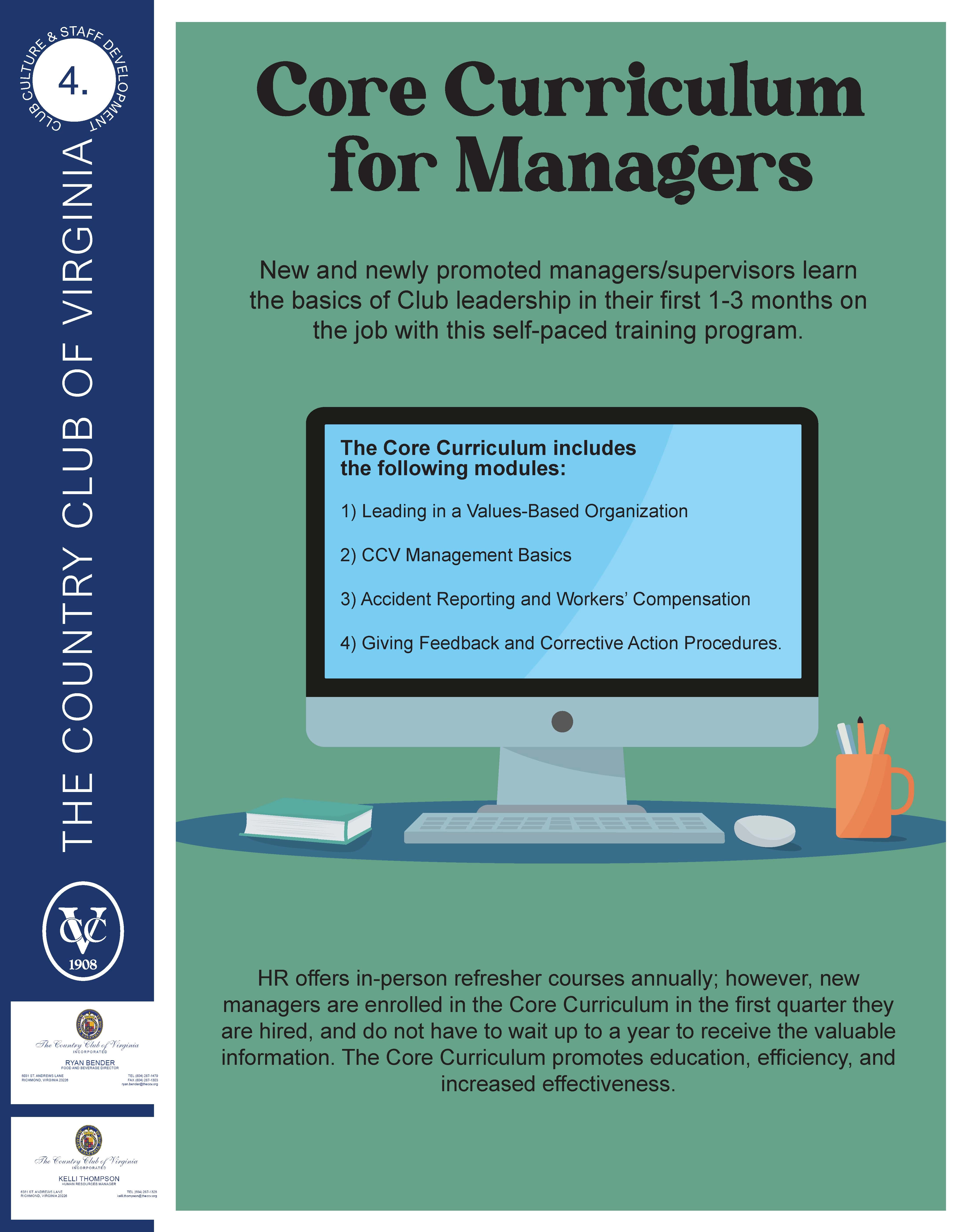 HR offers in-person refresher courses annually; however, new managers are enrolled in the Core Curriculum in the first quarter they are hired, and do not have to wait up to a year to receive the valuable information. The Core Curriculum promotes education, efficiency, and increased effectiveness.