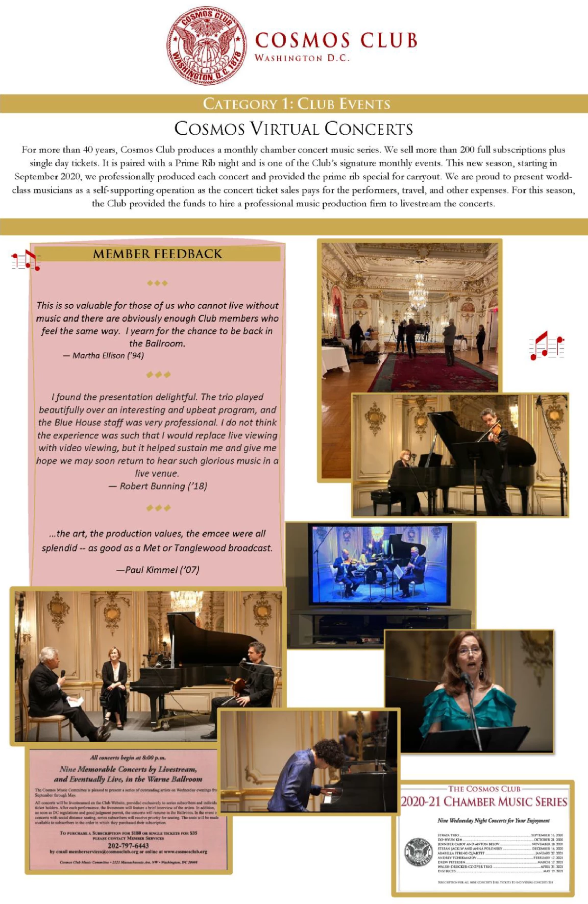 For more than 40 years, Cosmos Club produces a monthly chamber concert music series. We sell more than 200 full subscriptions plus single day tickets. It is paired with a Prime Rib night and is one of the Club’s signature monthly events. This new season, starting in September 2020, we professionally produced each concert and provided the prime rib special for carryout. It is world-class musicians and it also a self-supporting function as the concert ticket sales pays for the performers, travel, and other expenses. For this season, the Club provided the funds to hire a professional music production firm to livestream the concerts.