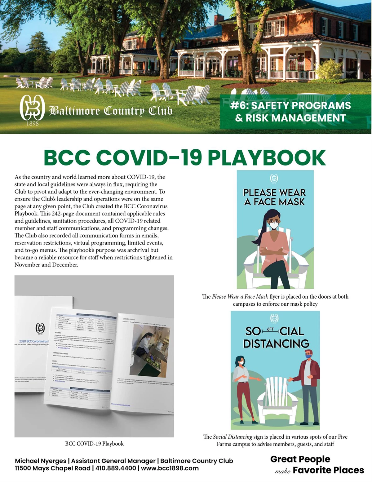 As the country and world learned more about COVID-19, the state and local guidelines were always in flux, requiring the Club to pivot and adapt to the ever-changing environment. To ensure the Club’s leadership and operations were on the same page at any given point, the Club created the BCC Coronavirus Playbook. This 242-page document contained applicable rules and guidelines, sanitation procedures, all COVID-19 related member and staff communications, and programming changes. The Club also recorded all communication forms in emails, reservation restrictions, virtual programming, limited events, and to-go menus.