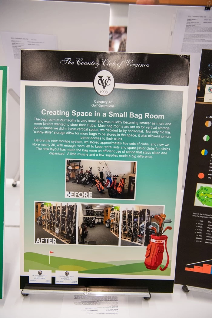 Before the new storage system, we stored approximately five sets of clubs and now we store closer to 30 with enough room left to keep rental sets and spare junior clubs for clinics. The new layout had made the bag room an efficient use of space that stays clean and organized. A little muscle and a few supplies made a big difference.