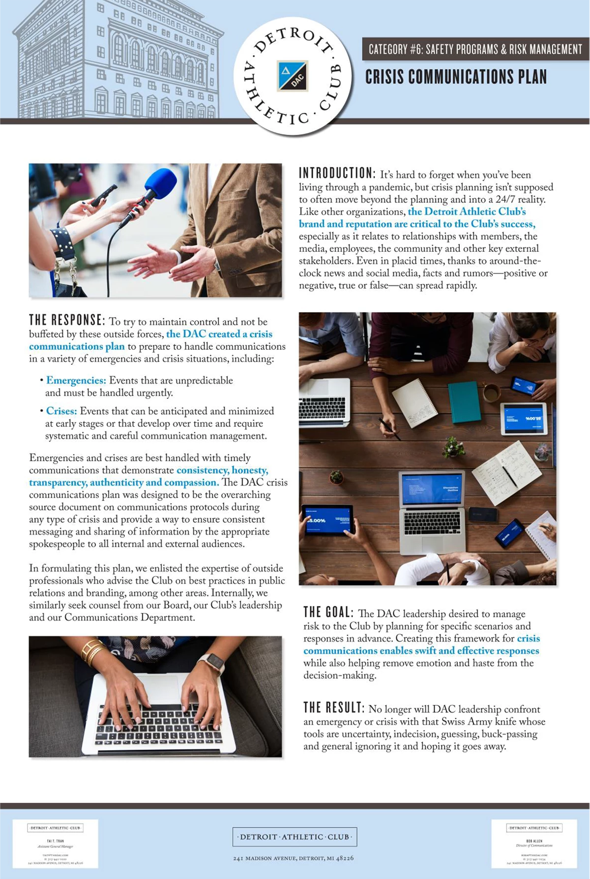 THE GOAL: The DAC leadership desired to manage risk to the Club by planning for specific scenarios and responses in advance. Creating this framework for crisis communications enables swift and effective responses while also helping remove emotion and haste from the decision-making.