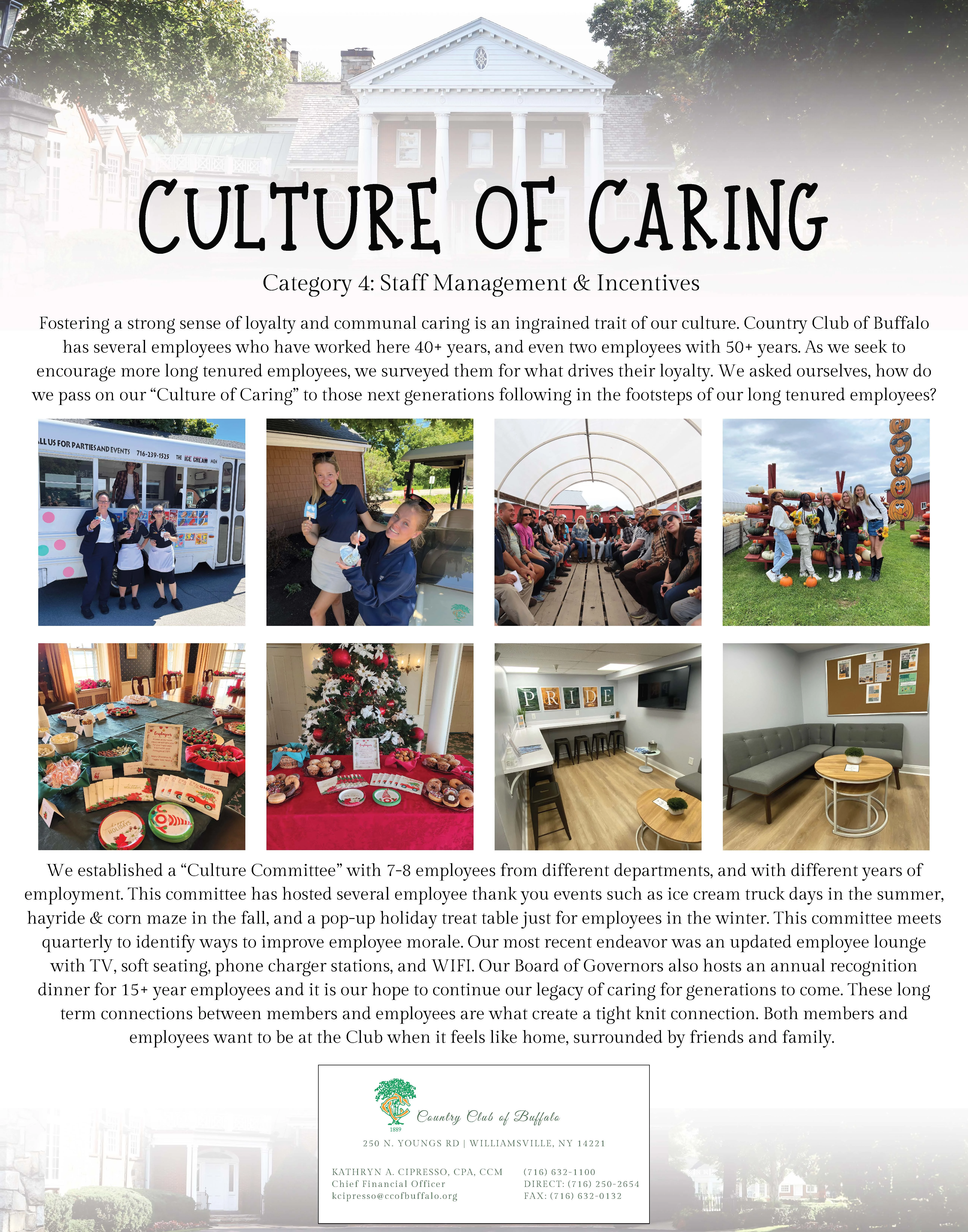 Fostering a strong sense of loyalty and communal caring is an ingrained trait of our culture. Country Club of Buffalo has several employees who have worked here 40+ years, and even two employees with 50+ years. As we seek to encourage more long tenured employees, we surveyed them for what drives their loyalty. We asked ourselves, how do we pass on our “Culture of Caring” to those next generations following in the footsteps of our long tenured employees? It is these long term connections between members and employees that create a tight knit bond. Both members and employees want to be at the Club when it feels like home, surrounded by friends and family.