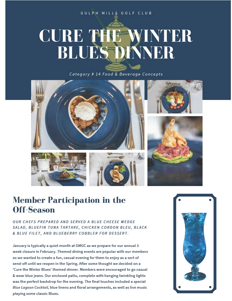 In the cold and windy winter of a Philadelphia January, Gulph Mills Golf Club hosted its first Cure the Winter Blues Dinner. Greeted by a special blue lagoon cocktail and blues music roaring through the speakers, guests headed to their tables to enjoy five courses each paired with a unique wine. Sommelier Michael Walsh provided details on each wine as members dined and devoured. Every dish was created with blue as its inspiration. Our chefs prepared and served a Blue Cheese Wedge Salad, Bluefin Tuna Tartare, Chicken Cordon Bleu, Black & Blue Filet, and Blueberry Cobbler for dessert.